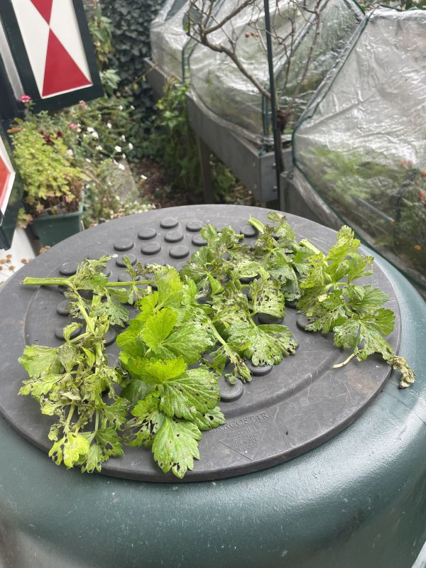 16. Oogstje van vandaag 😊 Mini bleekselderij geoogst… weet iemand hoe het komt dat dat blad er steeds zo uitziet…🤔 Bij de oude zaai was dat zo en bij de nieuwe nu weer….🤔🌱👩‍🍳🌱🐓🌱🎃🌱