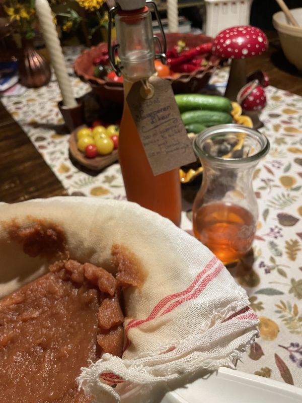 21. Oh ja ; fruitleer… dat is ook een idee… als ik de batch die ik nu heb dunner uitstrijk dan heb ik beide 👍😊 dank voor het idee @woldistel 🙏🏻😊 Ik heb 500ml kweeperen moes in een schone fles gedaan en er 500ml inmaakbrandewijn op gegoten…😊 10 dagen dagelijks omschudden en dan zeven en dan heb ik kweeperen likeur als het goed is…😊😋🌱👩‍🍳🌱🐓🌱🎃🌱