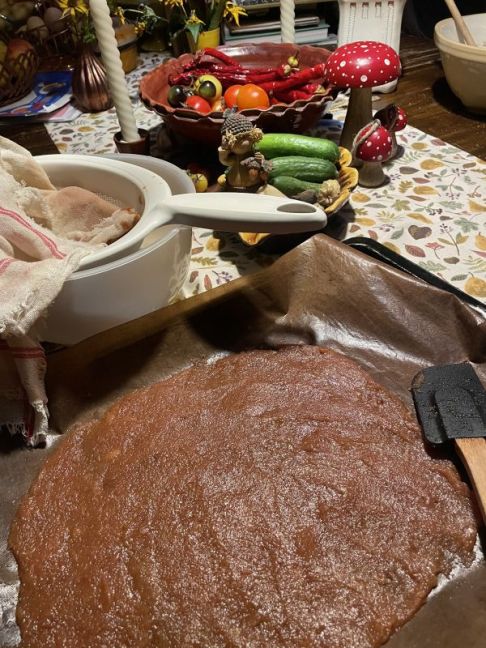 12. Mijn kweepeermoes op brandewijn gezeefd…Van de literfles ongv 750ml likeur 😋 De moes uitgespreid over silicone vel en ondervind de AGA ongv 90 gr , 4 uur. Weer heerlijke membrillo maar nu met “tic” ..te lekker gewoon!!! 😋😋😋 Voor herhaling vatbaar igv…😊🌱👩‍🍳🌱🐓🌱🎃🌱 In een “ kersterig” blikje met laagjes bakpapier ertussen gestapeld tot kerst! 😋