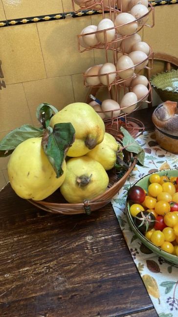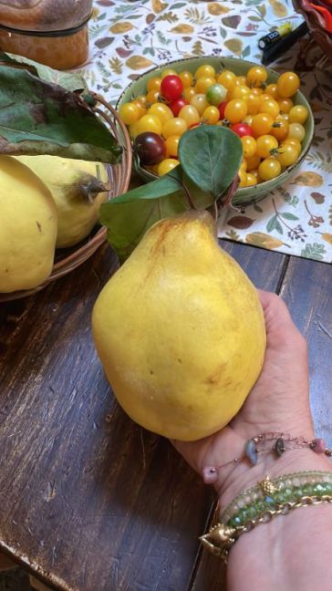 En van Jootje kreeg ik 5! Joekels van kweeperen! 😍😋🙏🏻 Die blijven nog even te Pronk op mijn keuken tafel liggen tot mijn fornuis in Oktober weer aangaat en dan ga ik ze heerlijk stoven om membrillo van te maken!! 😋🌱👩🍳🌱🐓🌱🌻🌱