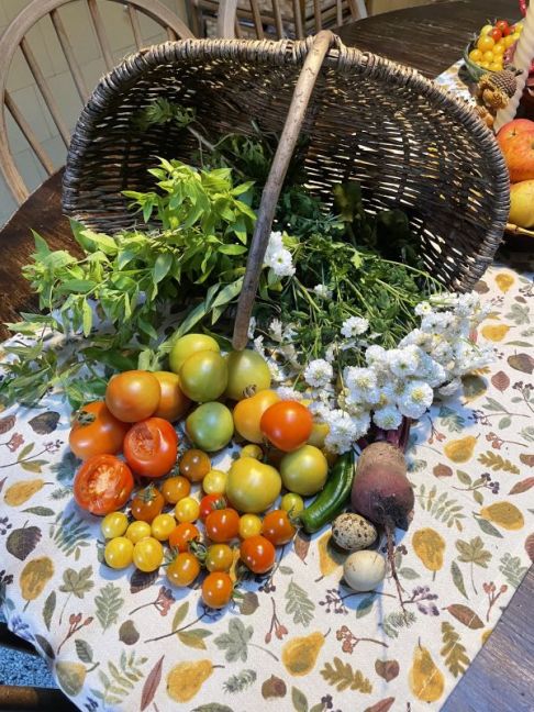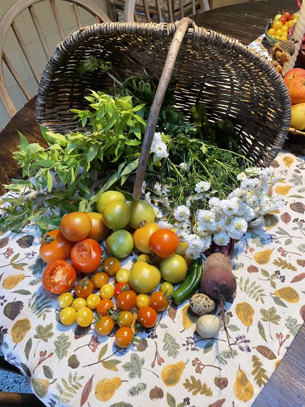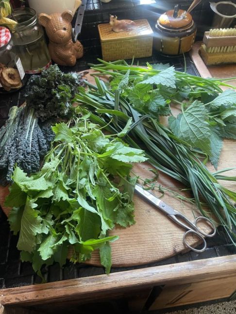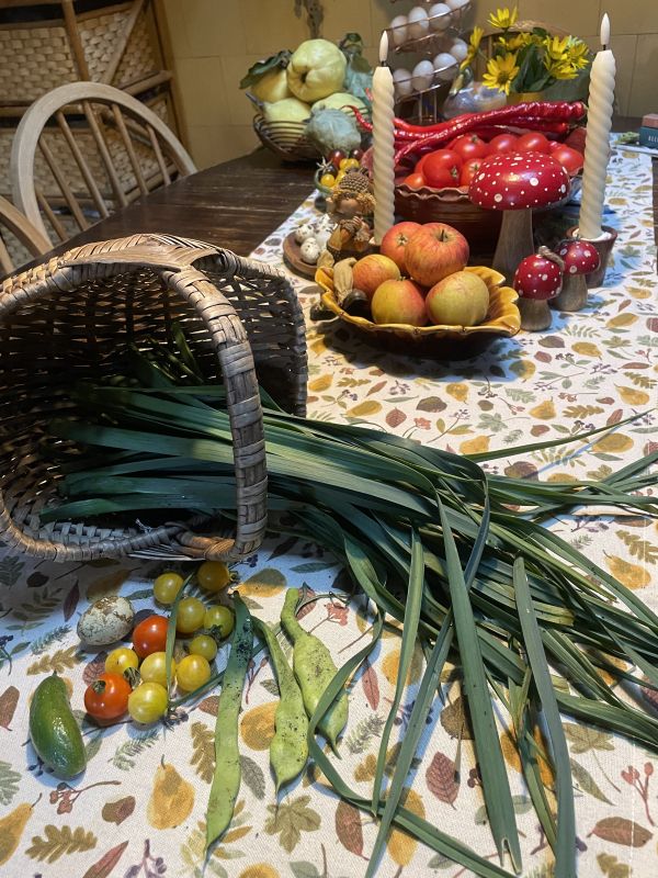 Oogst van vandaag 😊 Het word langzaam minder allemaal… jammer dat er een koude periode aankomt…het voelde zo heerlijk vandaag !!😍 Ook nog oogst uit mijn voortuinbakken; bosui groen, prei blad…1 vak Brocoletto …palmkool- en paarse boerenkool blad…. En brandnetel voor de thee..😊🌱👩🍳🌱🐓🌱🌻🌱
