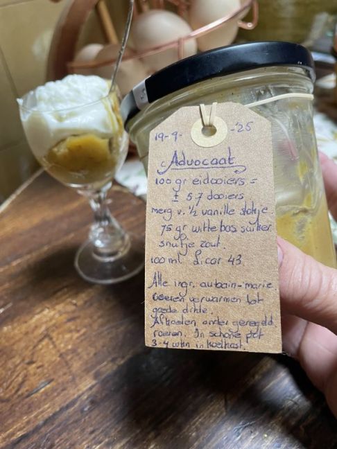 De smaak van deze gemaakte advocaat is caramelachtig door de likeur….😋 en de mijne is nu dikker dan gekochte advocaat… De eiwitten worden hier altijd schuimkoekjes @Petrasmoestuin want daar ben ikzelf en onze kleindochter dol op!!😋 Ik heb ook nog aantal recepten van koekjes waar eiwitten door gaan dus dat is hier geen probleem…👍😊🌱👩🍳🌱🐓🌱🎃🌱 Deze likeur heb ik gebruikt. 😋