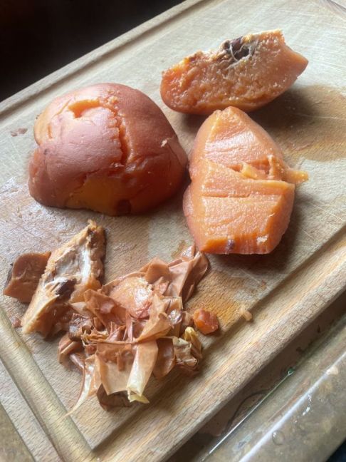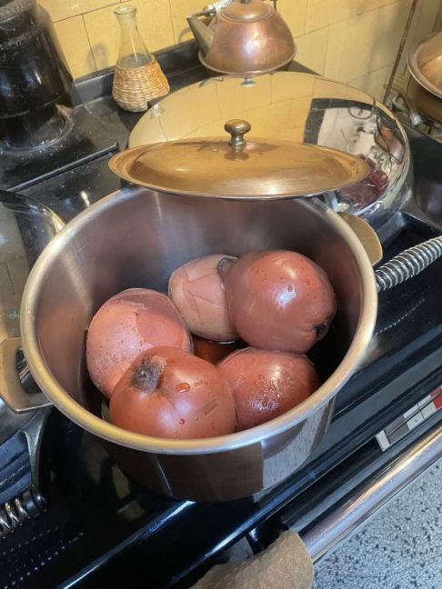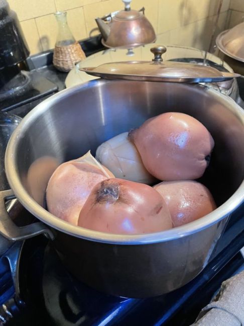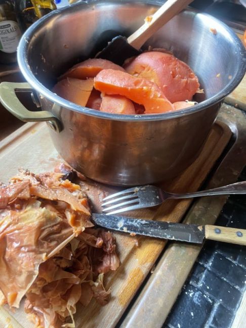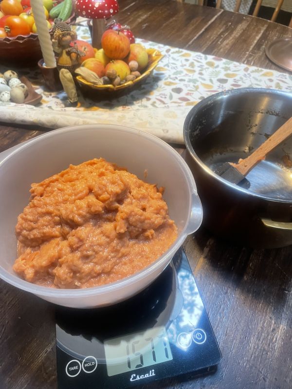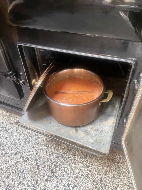 Gister was het 14 gr in huis… mijn lief mopperen waarom hij kou moest lijden…😅 Dus….🥁…..de AGA opgedraaid….😍 Ook omdat mijn lief de vriezer ging ontdooien en er sudderlappen nodig op moesten… dus meteen HET MOMENT om de kweeperen die ik van @jootje kreeg te garen…🙏🏻😊… Gisteraaf de hele peren in droge pan met deksel erop onder in de AGA (100 gr) gezet en vanmorgen mooie gare peren waarvan het velletje al los gaat laten 👍😊 Ik zet nog ff terug tot de middag dan heb ik tijd om ermee verder te gaan..😊🌱👩🍳🌱🐓🌱🎃🌱