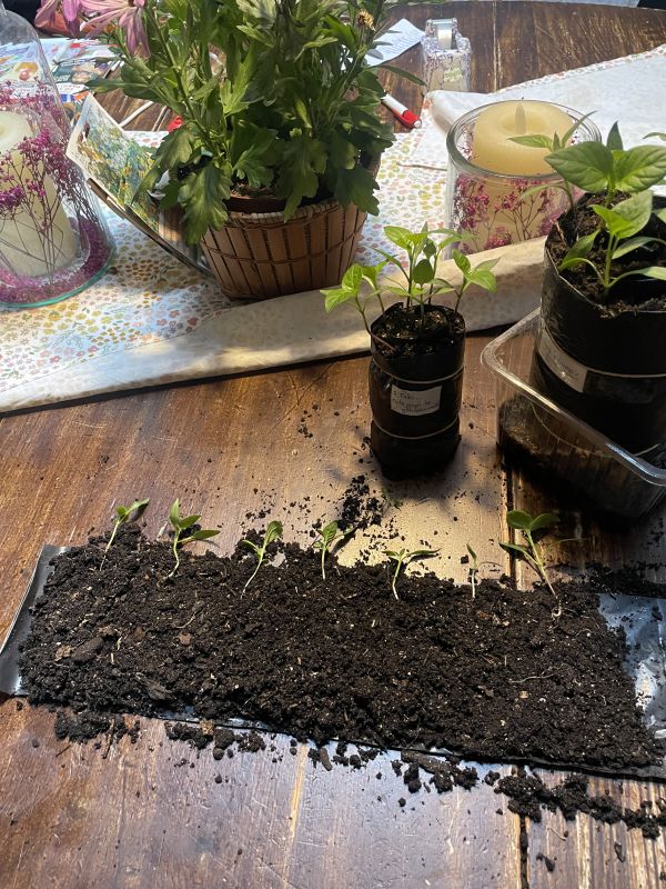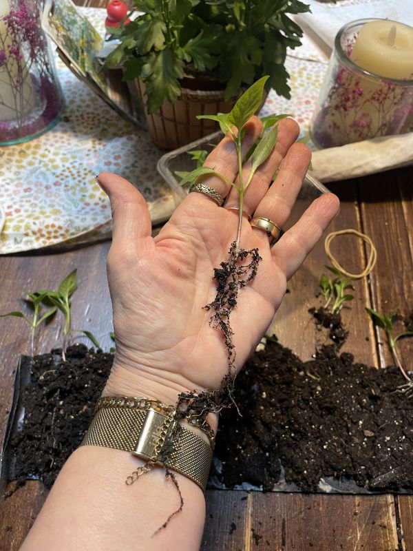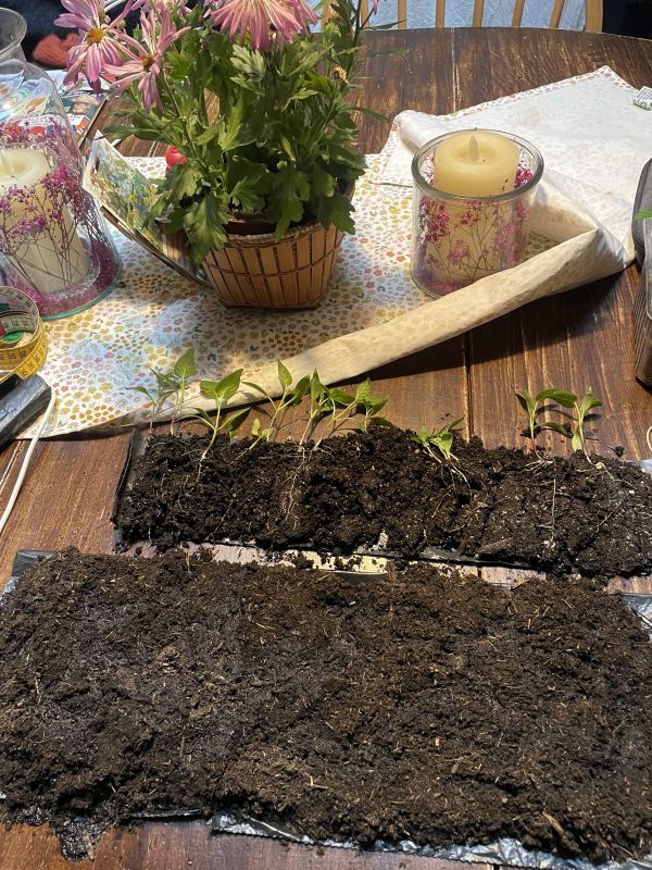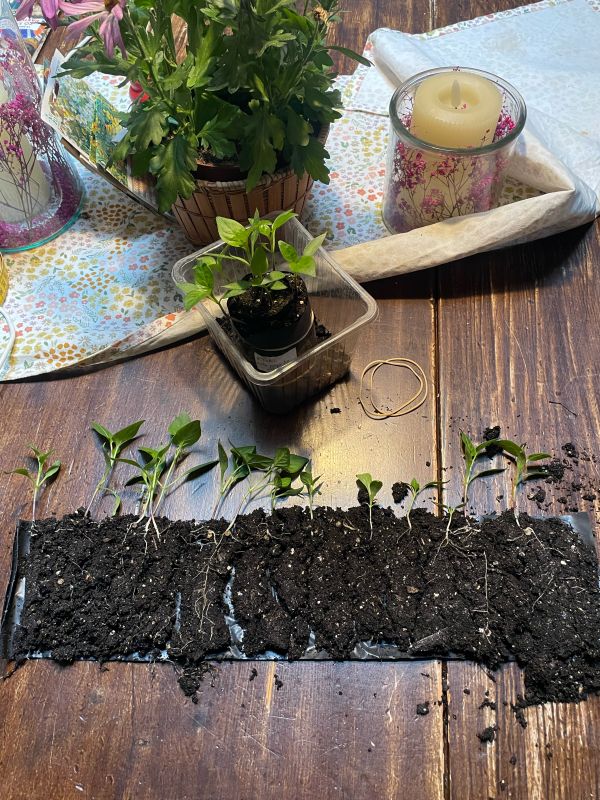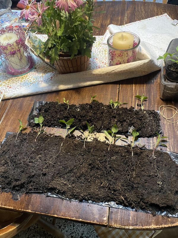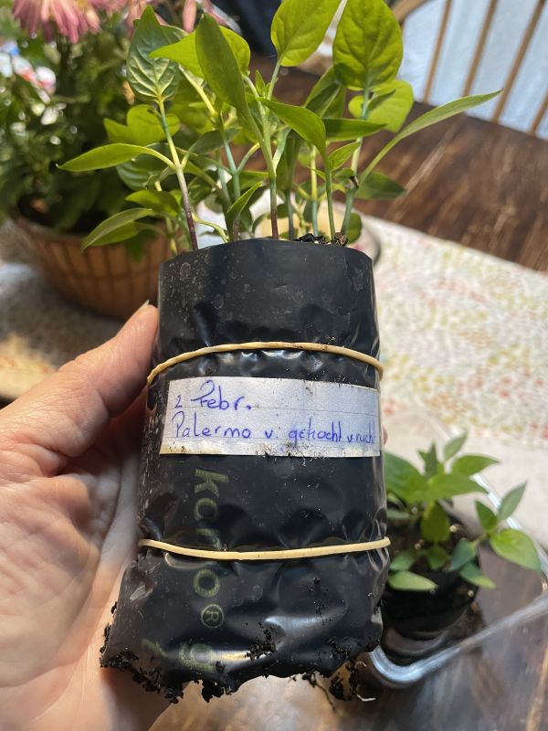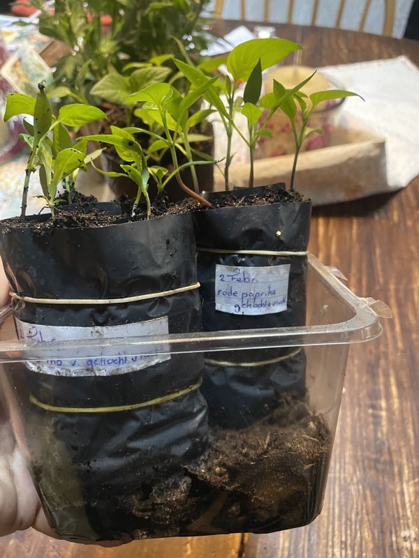 Ik heb gister mijn grootste paprika zaailingen in rol “verspeend” Ik zaai in gebruikte oude mm mix dus nu tijd voor wat voeding denk ik…🤔 Ik heb de rol afgerold en zie dat er een deel minder groot zijn..(zaadjes uit verse paprika) Maar kijk hoe mooi lang de wortel van de grootste al is! 😍 Ik besluit een iets diepere rol te maken en de grootste zaailingen wat verder uitelkaar wat meer ruimte te geven…. Ik zaai in oude gebruikte mm mix dus tijd voor wat voeding denk ik…🤔😊 Ik doe nu nieuwe (al bemeste) moestuinmix in de rol. Ik besluit om de kleinere plantje (als recerve) in hun rol te laten met ook wat meer ruimte nu de grotere plantjes eruit zijn. Ik zet deze dan OP een bedje van nieuwe bemeste mix zodat ook zij tzt voeding kunnen pakken… eens kijken hoe dit gaat….🤔 Vorig jaar zette in de zaailingen uit rol over in p9 potjes… maar uit oogpunt van ruimte besparing dit jaar eens kijken of ik op deze manier ze in rol binnen kan houden tot buiten uitplanten…🤞🤞🤞😊🌱👩🍳🌱🐓🌱☃️🌱
