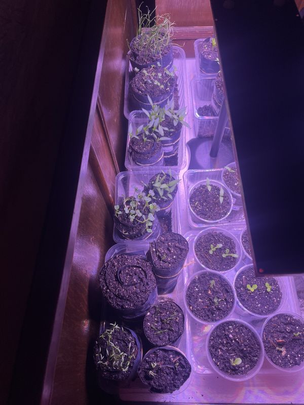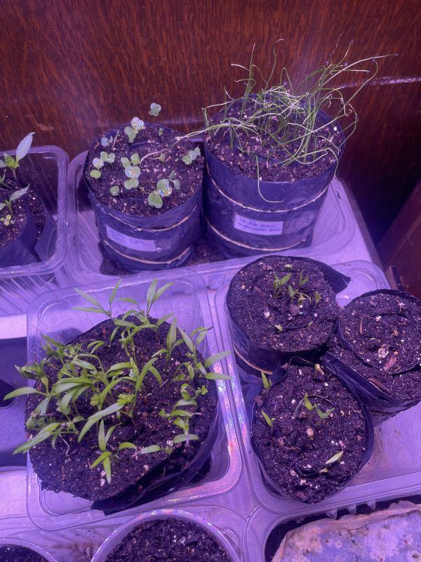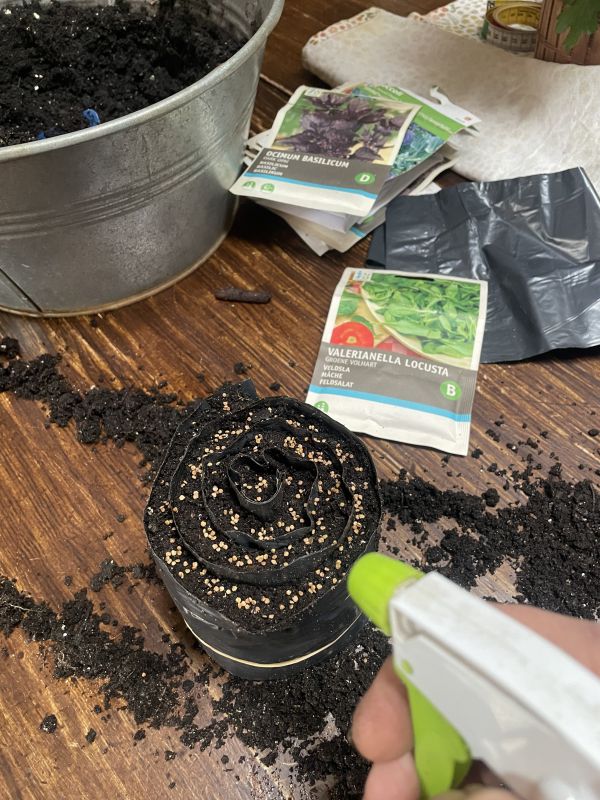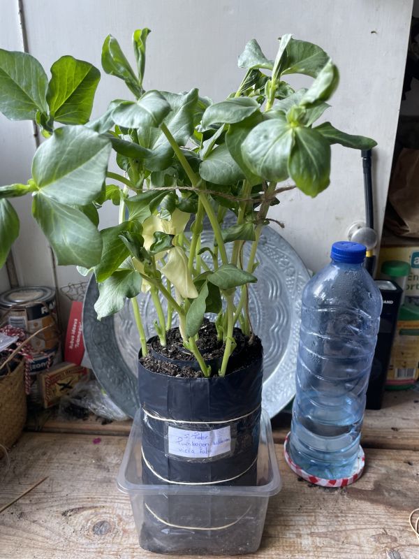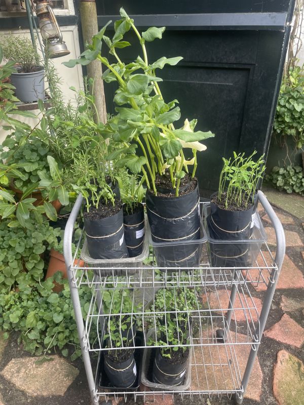 De afstand van zaaien in de rol doe ik op gevoel @Bernaar Dikker voor oude kleine zaadjes zoals bv kervel Netjes op een rijtje met iets afstand zoals de dikkere zaden van de peul vruchten. Dit zijn mijn tuinbonen ; Als ik de rol bij uitplanten weer afrol heb ik een rij bewortelde planten. Als ik langs een rek of in een rij plant kan ik zo de rij vanuit de rol met laag aarde en al in de gleuf iop de plek laten zakken en de gleuf weer sluiten met aarde. In een pot/zak verdeel ik ze over de plek. Foto net na uitplanten gemaakt dus planten tonen nog wat slapjes…🤔 Op deze foto zie je onder mijn groeilamp ook rollen met kleinere zaadjes zoals paksoi, rucola, kervel, bieslook Ook met afharden vind ik het makkelijk … En nog foto van hoe ik kleine zaadjes van bovenaf inzaai…..😊