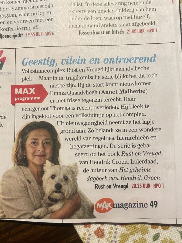 Ik las ooit een boek over het wel en wee van een groepje mensen op een volkstuin complex. “Rust en Vreugd” ( alleen die naam al 😍) geschreven door Hendrik Groen! 😊 Nu verheug ik me op as zondag want er is een serie van gemaakt voor op tv!! 20.25u op NPO 1 Ik ga igv kijken!! 😍🌱👩🍳🌱🐓🌱☃️🌱 ( als ik deze screenshot uit de tv gids niet mag plaatsen mag die verwijderde ik het weer hoor 🤔)