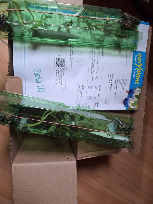Zojuist belde DHL aan met het pakketje van Baldur met de geënte tomatenplantjes, 2x vleestomaat Burleque, en 2x ossenhart tomaat Corazon F1. Ze lijken de trip in het doosje vanuit Duitsland overleefd te hebben, al hebben sommige wel een hele rare kromming waardoor de top naar beneden groeit. En ik durfde er niet teveel aan te rommelen omdat die entplek vast nog zwak is, ik hoop dus maar dat ze weer recht zullen groeien naar het licht. Op de plek van enten waren kwamen er allerlei worteltjes uit de bovenstam, sommigen waren zelfs al geworteld in het kluitje grond, en die heb ik maar afgeknipt. De plantjes waren relatief duur, en ik mis een beetje de charme van het helemaal zelf opkweken uit zaad, maar mijn eerdere eigen ent probeersels waren niet succesvol en ik hoop op een goede oogst van deze plantjes. Ze mogen nog even een weekje recupereren bij mij thuis op zolder en dan krijgen ze straks een ereplekje in de kas,