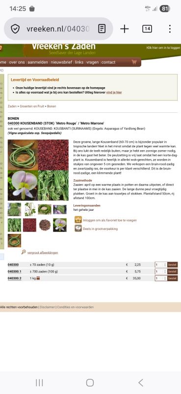 Ik ga niet naar de Moestuindag maar vorig jaar had ik ook kousenband van Vreeken in mijn kasje gezet en inderdaad er zaten heel veel boontjes in het zakje. Ik kreeg luizen in de planten , de oogst die ik had viel nogal tegen, en de ruimte in mijn kasje is zeer beperkt. En wil je kousenband kweken buiten heb je een echte warme zomer nodig voor Nederlandse begrippen. Kortom, ik ga dit jaar geen kousenband zetten dit jaar, maar dat aangebroken zakje zaden moet ik nog ergens hebben liggen. Geen idee wat het verschil is , maar ik had de "metro rouge" variant. Als je interesse hebt stuur me dan even een priveberichtje, dan wil ik wel wat boontjes opsturen in een envelop, ik hoef er niksnvoor te hebben.