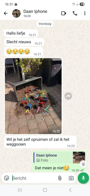 Ja dat joch, hij is 15, heeft meer verstand van computeers dan ik, maar AI wordt steeds vernuftiger en steeds makkelijker. Hij heeft dus een foto gemaakt van die kweekbak, die geupload naar chatgpt, en een zinnetje gezegd in de trant van : bewerk deze foto tot een omgevallen bak met allemaal geknakte plantjes.... En voila... Precies dezelfde rode en blauwe potjes. en dezelfde achtergrond..... Achteraf ziet de foto er wel nep uit, die aarde zat alleen in de potjes en niet in de kweekbak zelf.... Maar ik was er dus wel mooi ingetuind