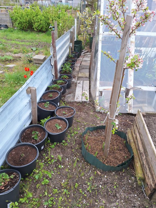 Mijn kas een klein beetje uit elkaar gehaald om palen te bevestigen voor mijn toekomstige afdakje wat ik tzt wil maken En heel erg provisorisch de zijkanten verticaal weer dichtgemaakt met stukken perspex. Je kijkt er dwars doorheen en dat is 's-winters vast geen voordeel , maar misschien 's- zomers als het bloedheet is binnen weer wel om een beetje door te luchten. Tussen de schuine schoren aan de buitenkant van mijn kasje heb ik voor nu wat emmers met aardbeien gezet, de bedoeling is dat er straks ook paprika- en peperplanten in emmers komen op het stukje. Maar voorlopig moet ik de komende weken nog even wat hout bij elkaar te zien verzamelen voor een afdakje van 4 covidschermen. Edit : en het Bob bordje opgehangen