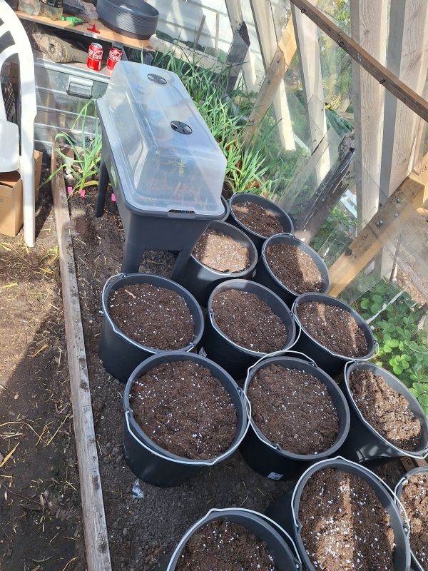 4 zakken potgrond gekocht bij gamma (1+1 gratis), een kweektafel van de action, en 6 bouwemmers van 20 liter. Verder een pioenroos geplant van de vriendenloterij, beetje water gegeven, en perliet door de potgrond gemend in de bouwemmers