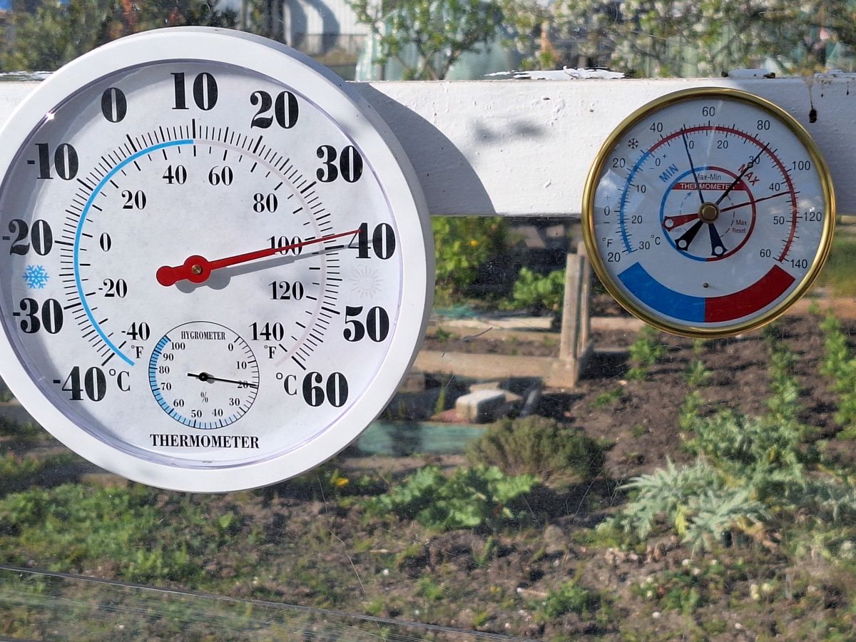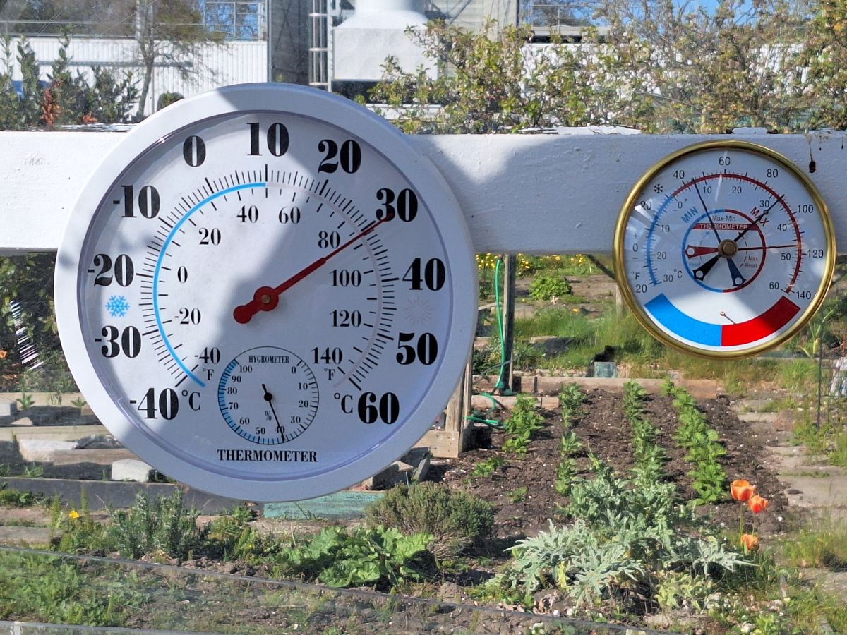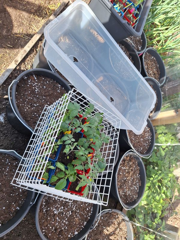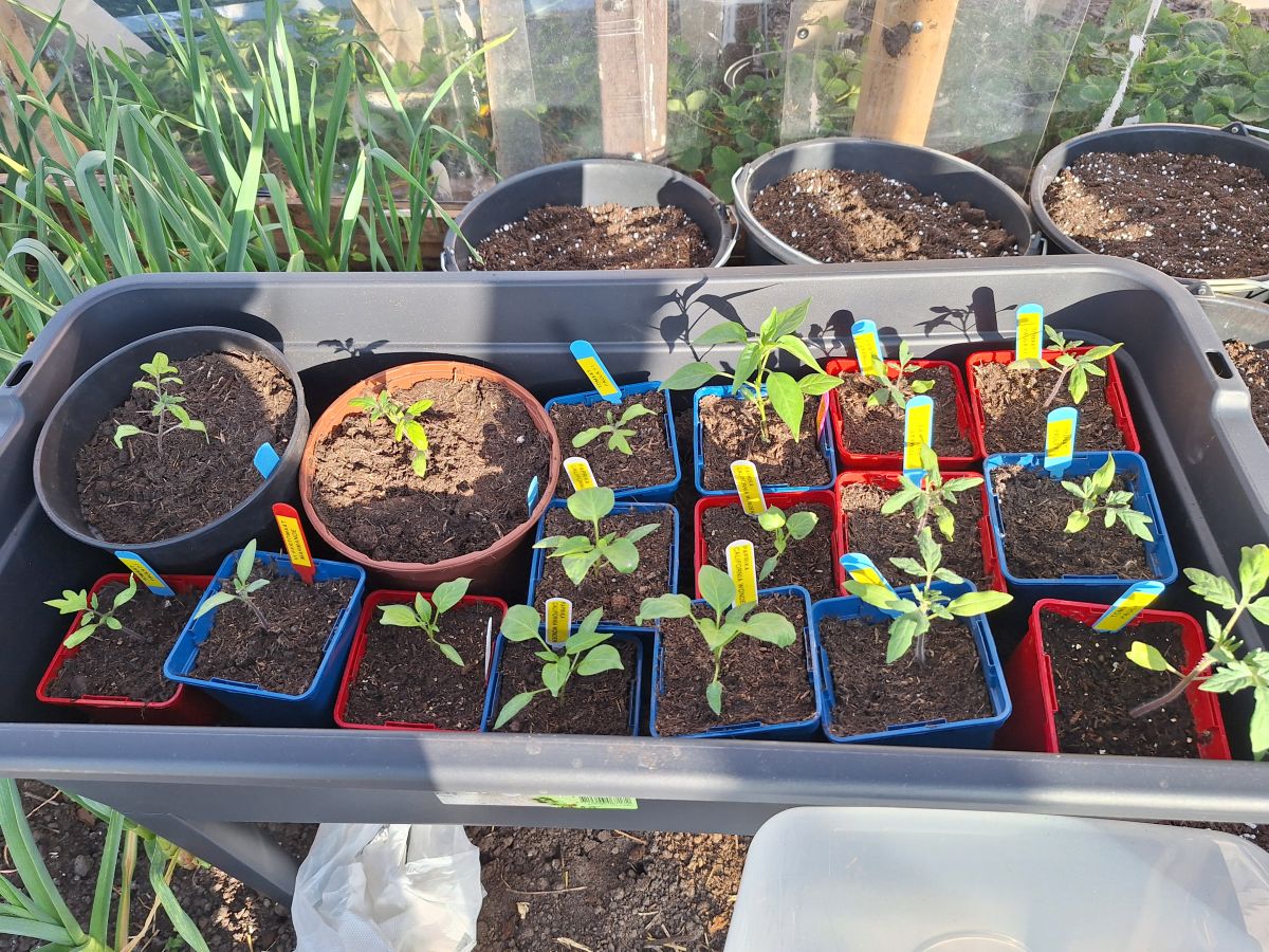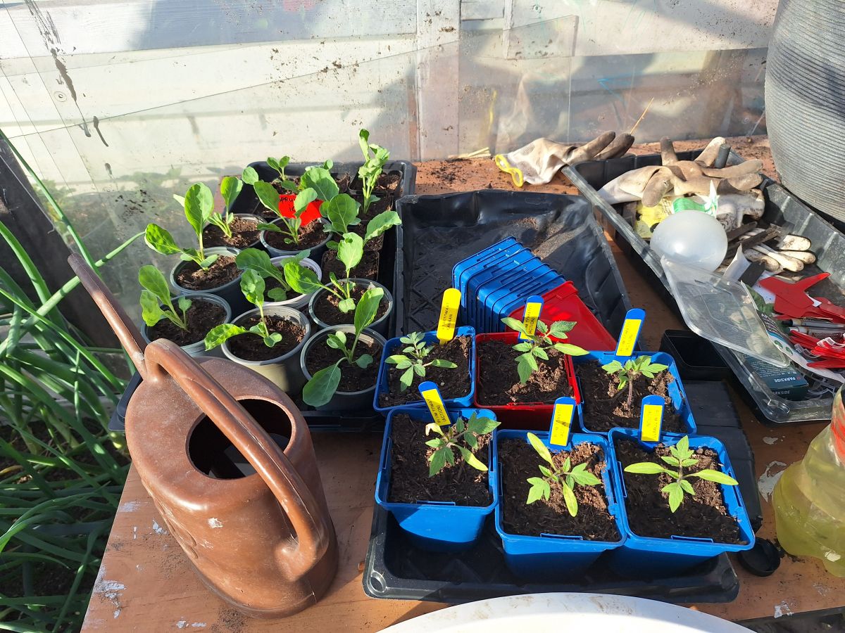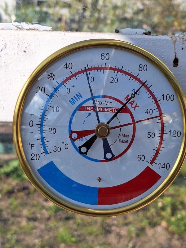 Ik was sinds zaterdag niet meer op de tuin geweest maar ik ben er nu even om de potjes zaailingen van tomaten en paprika's in mijn kasje even water te geven. De min max thermometer geeft aan dat het in de kas sinds zaterdag minimaal 9 en maximaal 41 graden celcius was. Al vraag ik me af in hoeverre die metingen kloppen, want de thermometer die er al hing geeft zomaar een verschil in+ temperatuur van bijna 10 graden aan met de min/max thermometer. Moet vast door Temu geijkt zijn haha. Hoe dan ook, de tomaten staan er nog best bij en lijken niet erg geleden te hebben onder de temperatuur en zijn ook nog niet verdroogd. Zowel die in de kweektafel als in de losse potjes op tafel stonden. Dat geeft me goede hoop dat ik de overige tomaten ook wel in de kas kan zetten al.