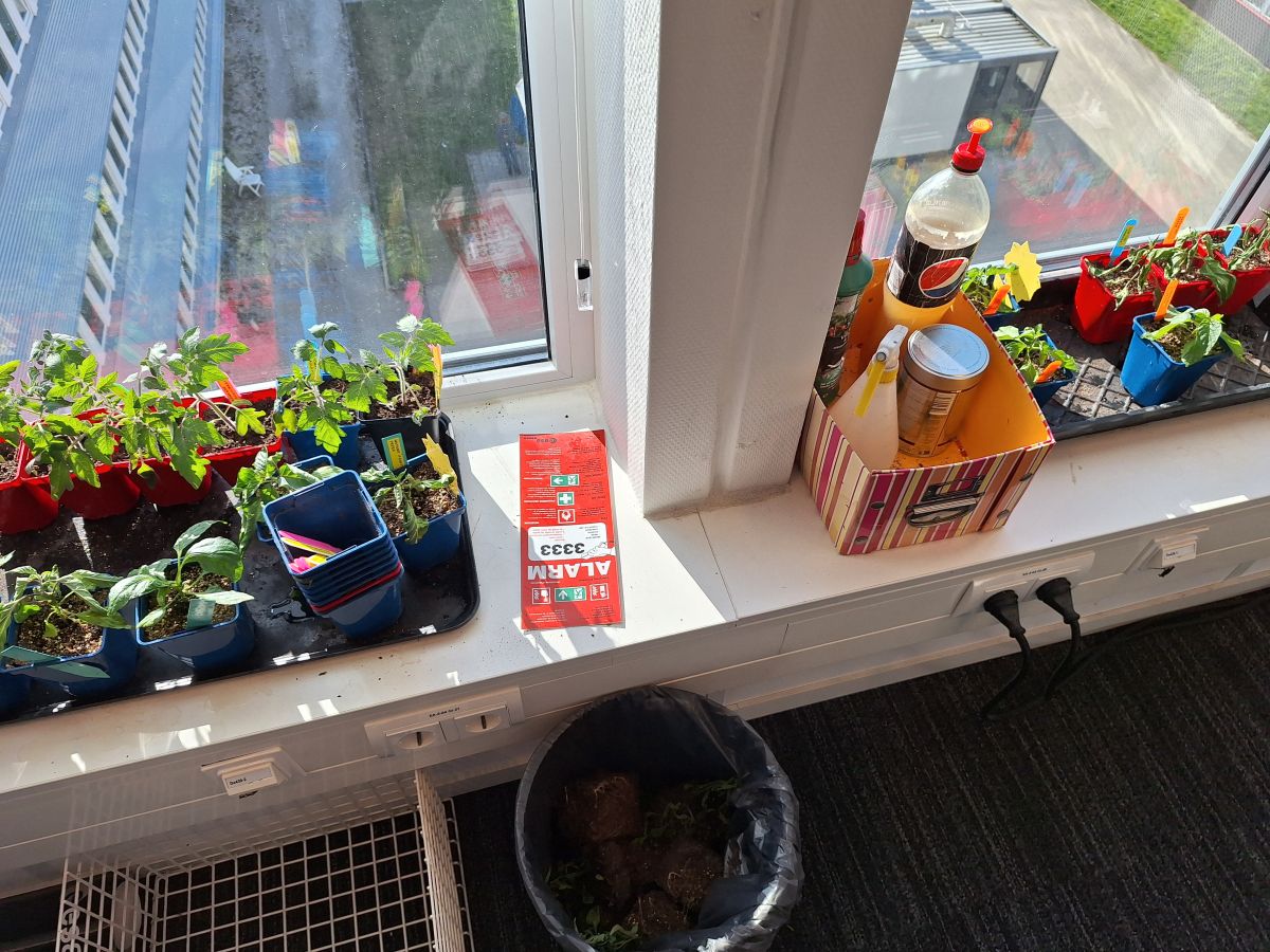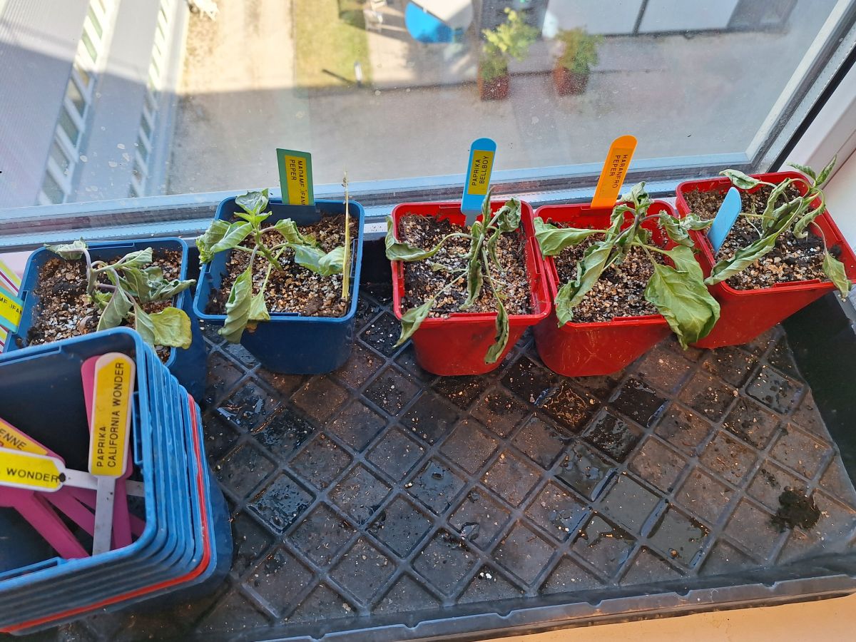 De peperplantjes bij mij op kantoor gingen aanvankelijk heel goed maar stierven af☹️. Ik telewerk op dinsdag en op vrijdag, dus normaliter geef ik de plantjes wat extra water op donderdag zodat ze genoeg water hebben tot maandag. Maar de 2 laatste maandagen had ik vrij genomen en dan is de periode tussen donderdag en woensdag wel erg lang .Afgelopen zaterdag was ik speciaal nog even naar kantoor gegaan om ze water te geven maar toen zagen ze er al slecht uit. De meeste peperplantjes die er nu nog staan zien er ook niet heel best uit en ik vermoed dat deze het ook niet gaan redden. Ik vermoed dat ze zijn verzopen en daarna zijn verdroogd. Of het moet toch een bemestingsprobleem zijn geweest. Gelukkig staan de enkele tomatenplantjes er nog goed bij, en gelukkig heb ik thuis op zolder nog een boel reserve peper- en paprikaplantjes (ook al zijn die een stuk kleiner gebleven door gebrek aan zonlicht).