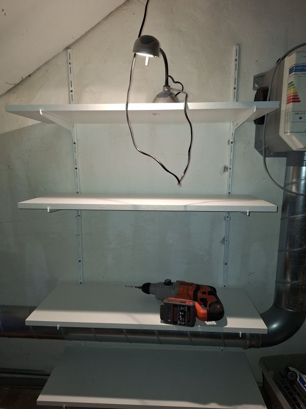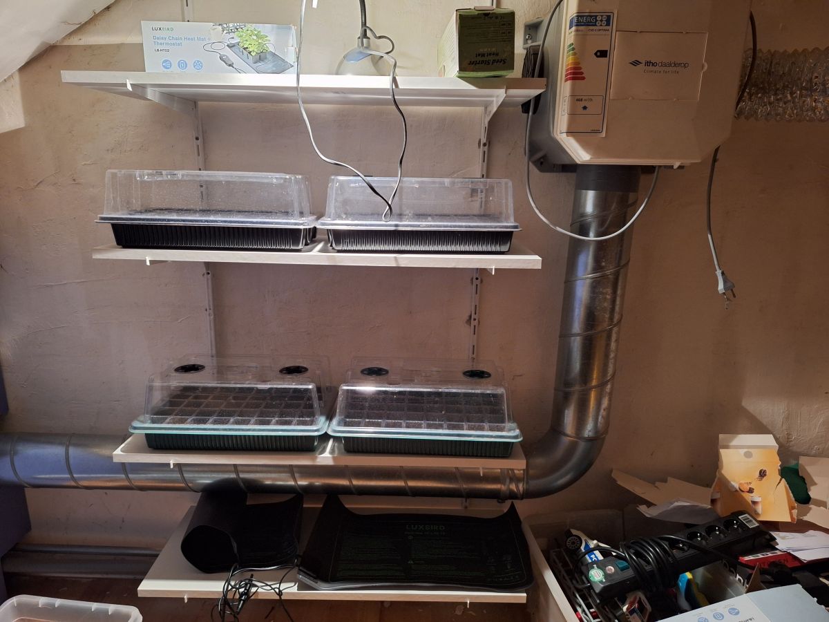 Vorig jaar had ik allemaal kweekbakjes her en der op de grond op de rommelzolder. Om enigszins orde in de chaos te scheppen heb ik van die ophangstrips met beugeltjes en een paar planken gekocht. Op ieder plankje passen precies 2 van die kweekbakjes, ik zie alleen nu dat de plankjes eigenlijk net iets te klein zijn voor 2 warmtematjes, en op dat onderste plankje past niet veel vanwege een lelijke luchtpijp die daar loopt.... maar goed, niemand is perfect, toch blij mee. Volgende week begin ik met pepertjes en paprika's voor te zaaien.