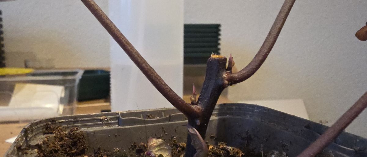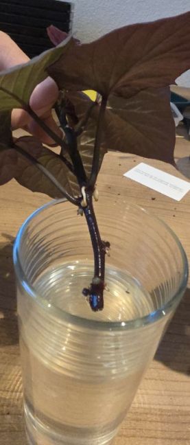 Zo ga ik het dit jaar ook doen. Ik zie links en recht in de oksels van de plant die ik afgeknipt heb al nieuwe stekken ontstaan. Ik wil ze dit jaar zo laat mogelijk in een pot laten groeien. Want eerdere jaren waren de kluiten veel te volgroeid waardoor ik veel gedrongen zoete aardappels kreeg