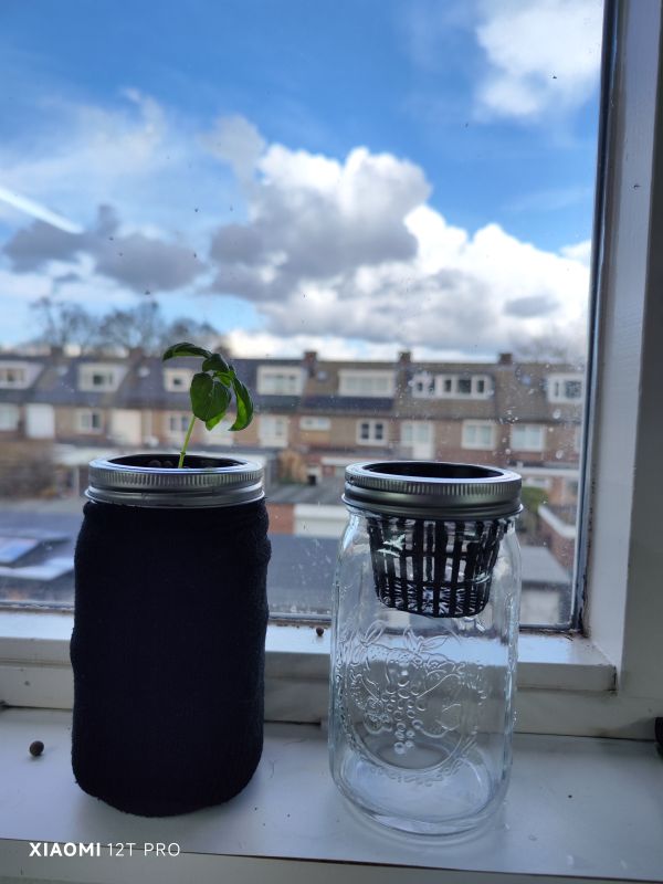 TJs indoor hydroponics reageerde op TJs indoor hydroponics's topic in Square foot gardening en tuinieren in pottenUpdate: zo juist mason jars bijgekocht voor kratky van kruiden zoals basilicum. Had een leuke tip gelezen om algen groei tegen te gaan met een sok. Ook passen de net cups precies in de quart mason jar maat. Ideaal dat die deksels uit 2 delen bestaan hierdoor hoef je ook niet te boren. En vind ze er nog leuk uitzien ook