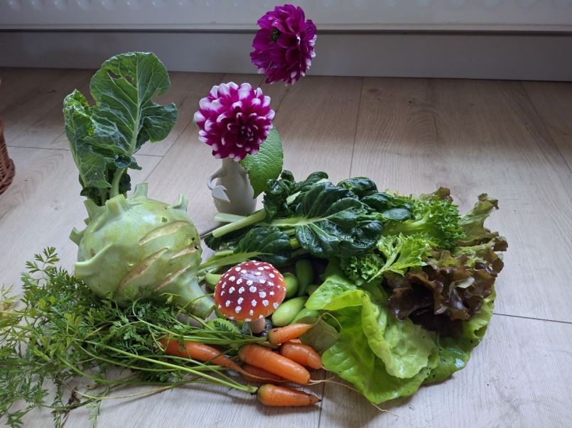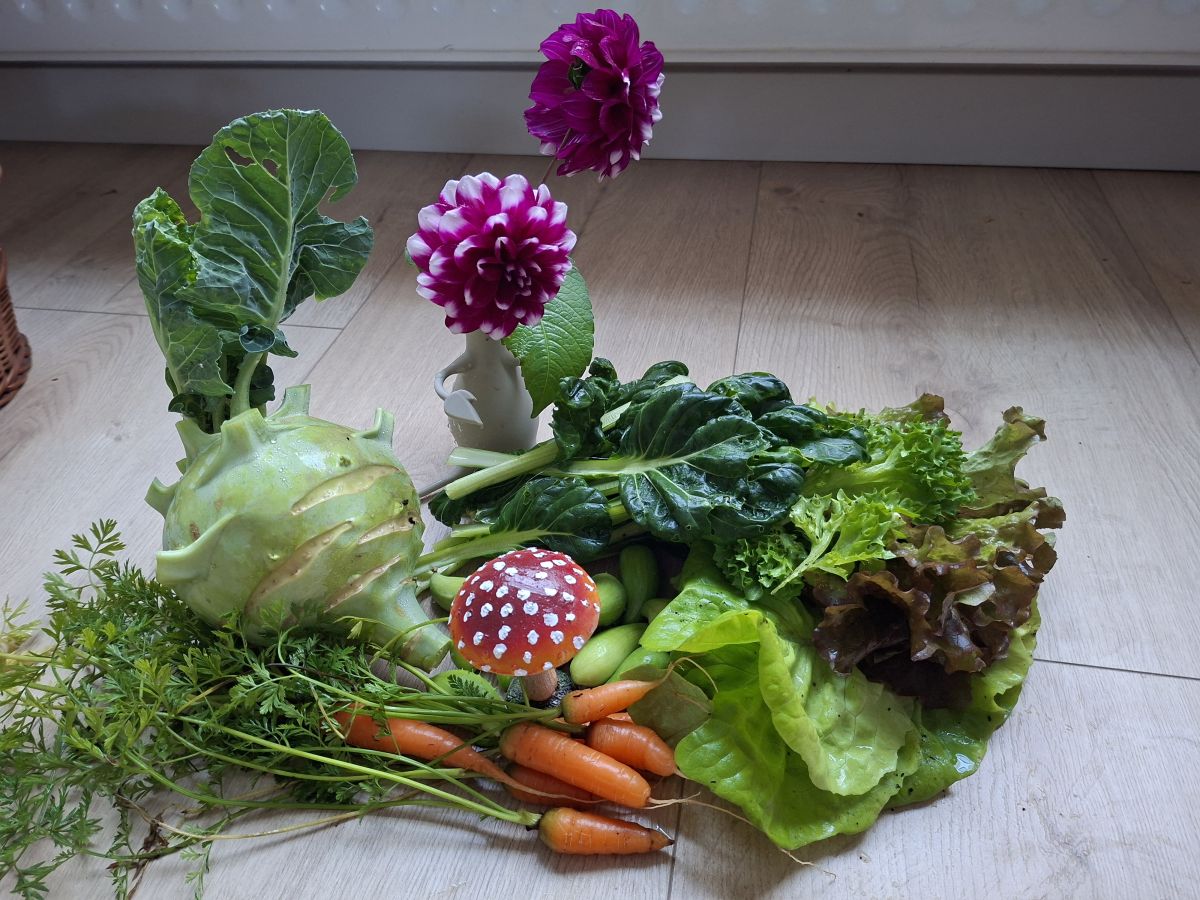 Dit topic brengt me in beweging.😅 Laatste dahlia s Reuzen koolrabi in mini Voor eerste keer tatsoi Nog 3 slasoorten. ( heel de zomer geen sla gekocht) Worteltjes willen dit jaar niet. Olijfkomkommertjes is een echte volhouder. Oogst nu nog zaad van winterklimmer en blad van Oost Indische kers om te drogen. Laatst soep gemaakt van linzen en Nieuw Zeelandse Spinazie. Gauw laatste blad oogsten en dat recept weer opzoeken. Wie had dat gedacht dat we rond deze tijd nu de Sint gearriveerd is nog zoveel kunnen oogsten. 🌱😀🌱