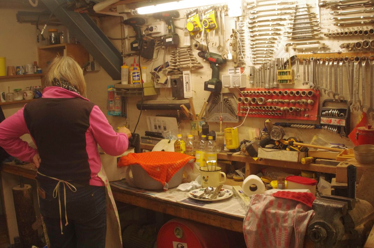 Mijn vrouw heeft oliebollen en appelflappen gebakken in de schuur. Van tevoren moet ik de werkbank leegmaken en de kachel aansteken.