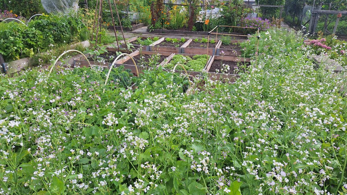 Het wilde karakter is met opzet. Ik plant alles vrij dicht opelkaar en ook doorelkaar, met plukjes bloemen ertussen. Zo ziet het er wat natuurlijker uit. Misschien iets minder opbrengst, maar we krijgen het nu al bijna niet weggegeten.