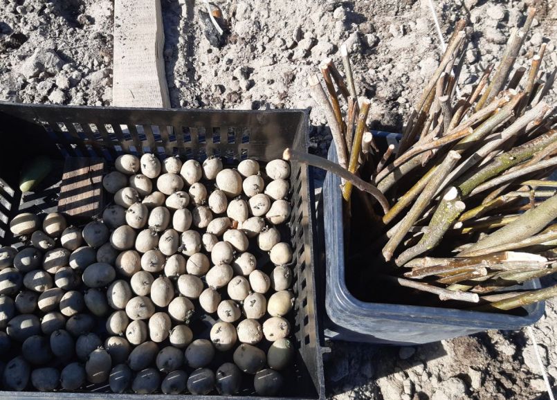 8. Dat gebeurt in het licht want je wil korte gedrongen spruiten hebben en geen lange witte uitlopers die zo afbreken. Ik geef ze binnen een par dagen een warmtestoot zodat ze allemaal op gang komen en leg ze dan licht, koel en vorstvrij weg. Bijv. inde koude kas of onder de tuintafel op het zuiden. De kant met de ogen naar boven naar het licht. De uitlopers mogen een paar cm lang worden voor het poten op zijn vroegst in april, want ze kunnen geen vorst verdragen. Hele vroege primeuraardappels kunnen wat eerder maar die moet je tegen nachtvorst beschermen tot de IJsheiligen. Kijk ook eens op mijn Blog of in de aardappeltopics van '22 of '23 om te leren wat je moet doen. Succes. Foto van mijn Blog van voorjaar '23, de poters voortrekken in de lage kas: Klaar om te poten: Dit gebeurd er als ze te warm en donker staan: Oorsprong foto: