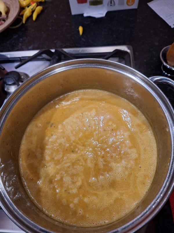 Pompoensoep. Met pompoen uit mijn moeders tuin. De knoflook en rode punt paprika's uet. De uien, kruiden en boursin zijn gekocht.