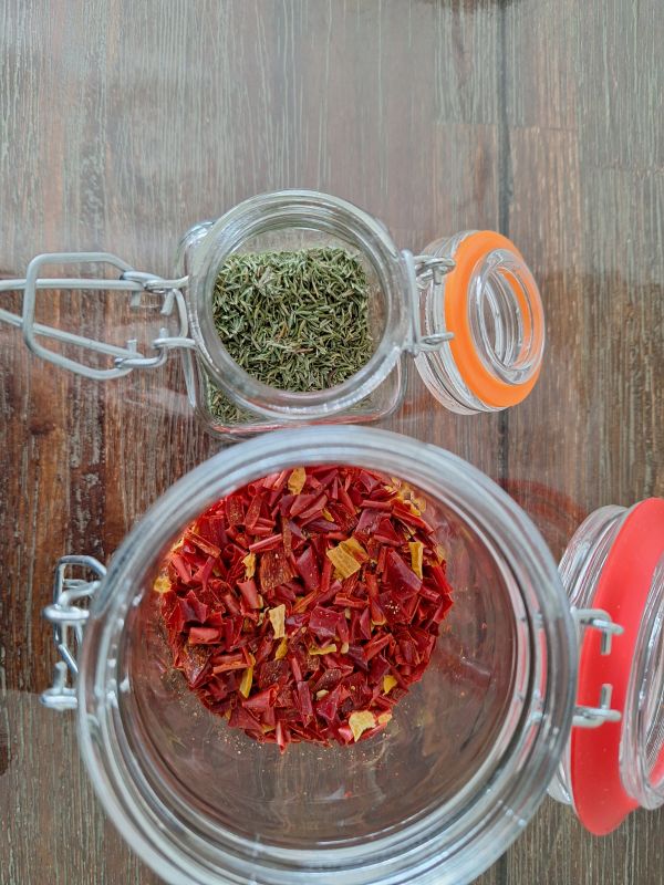3. Tijm en pepers gedroogd en vanmorgen verwerkt en in potjes gedaan.