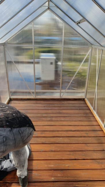 Vandaag de laatste hand kunnen leggen aan de kas. Jullie zijn dol op foto's heb ik begrepen: wel hier dan! Ik wil aan de linkerkant een border maken en aan de rechter kant een lage tafel voor potten. Als dat klaar is zet ik wel even betere foto's. Pit