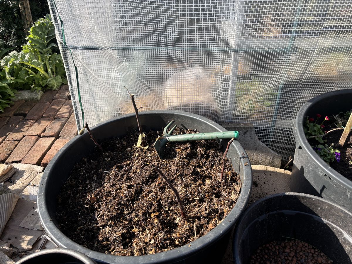 @Lsjr33 ooooo man, 30 weken! Bikkel 💪🏻💪🏻💪🏻 Gisterenavond dompelpomp aangesloten. Zo blij dat die uit de sloot was. Gisteren heel veel water gegeven. Was echt nodig. Vanochtend doordat ik een ongewenste boom moest planten, compostbak zitten graven. Kruiwagen vol compost. Beetje bij de boom. Rest in een grote pot waar ik 4 vijgen van @acpronk in heb gezet. Die heb ik nu al dik half jaar binnen in een pot staan. 3 weigerden te wortelen. Overige 4 dus wel. Die staan nu in die mega pot. Tzt gaan er 2 uit. We zien nog wel wie. Nu eerst maar aanslaan van water naar aarde. In die pot ga ik ook mijn komkommers telen. De vijfjes zijn nog geen 20 cm. Dus ze hebben nog wel even. Kippen laten grazen. Toen was het klaar. Nugget at schaamteloos de aardbeien op.
