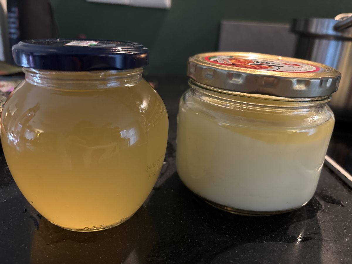 Gisteren van de slager botten gehad. Ik heb het gekookt. Dit vet links dat vloeibaar is, is er van af gekomen en heb ook mijn oude potje aan kunnen vullen. Niet verkeerd voor een handje botten. (Nou ja, toch wel ruim een kilo) Ik gebruik het vet om vlees mee te bakken, door stamppot of voor door de jus. Bouillon doe ik in kleine boterhamzakjes omdat het zo geconcentreerd is van smaak. Anders vind ik het te heftig door soep, risotto enz. Door ındonesische rundvleessoep doe ik wel meer. Maar dat is dan weer een uitzondering. Dit jaar een fikse voorraad en ben er blij mee. Voel me echt enorm opgepept na soep en dat eten we toch meerdere keren per week bij de maaltijd.