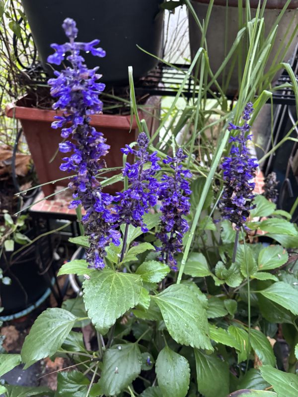 blauwe salie en eronder nog een rode. Is dit cassis? Geen idee maar wel heel mooi. Stelt nooit teleur en is met kerst de enige die nog altijd bloeit.