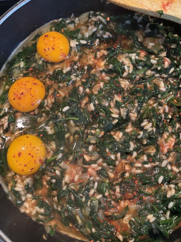 Ik heb de knoflookpot uitgeschud en alles wat lelijk was, weggegooid. Heb ook heel veel broedbolletjes onder in de pot gevonden. Even opzij. Misschien dat ik er nog wat mee doe. Met de knof en gekochte spinazie en zelfgemaakte chilivlokken en MM spinazie gemaakt. Met 3 eigen eitjes omdat de kinderen het liever zonder eten. Of liever überhaupt geen spinazie 😆 Hadden ze toch even pech. Lekker met een klodder yoghurt. Ik ben er gelukkig wel dol op. Hier nog niet gaar