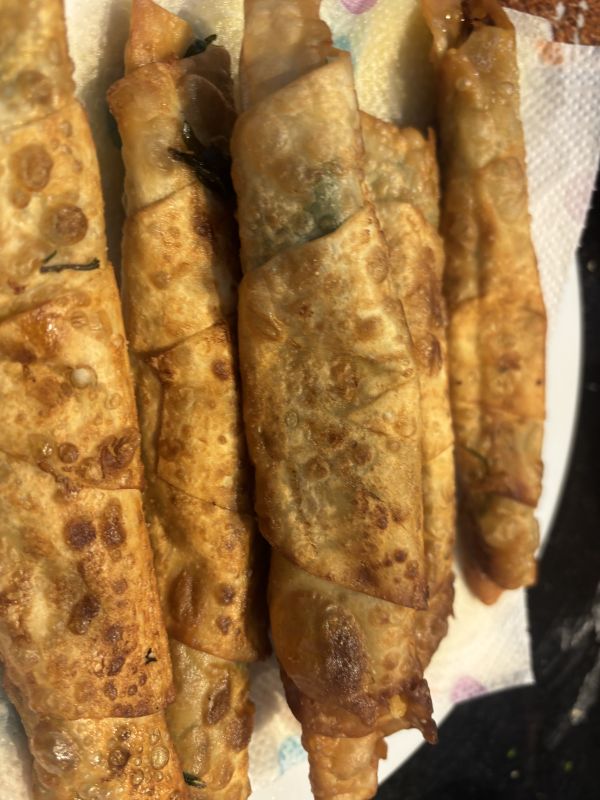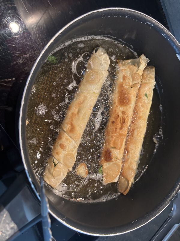 Ik had börek rolletjes gemaakt en een plaat gewone. Daar geen foto van zie ik. Met eigen kruiden zoals peterselie, maar ook chilivlokken en de knoflook en lente ui. Rest gekocht. Was heerlijk. Zowel het deeg als de vulling is exact hetzelfde, maar vanwege andere bereiding totaal andere smaak. De helft van de plaat börek mee naar een begrafenis. Het was goed.