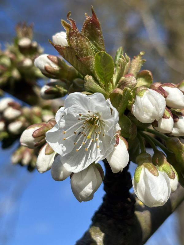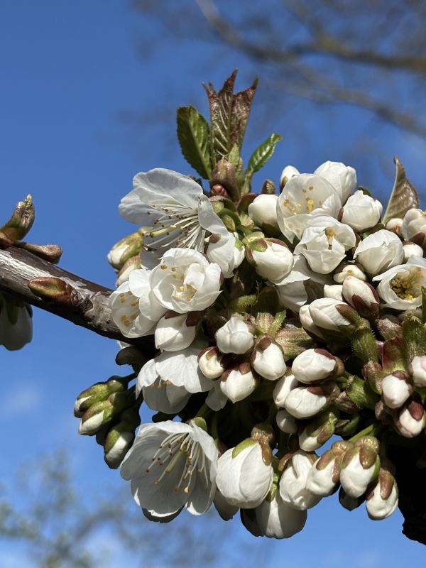 Deze kers is heel lelijk geënt en vanaf het moment dat ik de boom had gekocht, heb ik al een hekel aan zijn kromme staat. Maar! Wel de enige kers waar we elk jaar rijkelijk van plukken. Dus hij blijft in al zijn kromheid 🤭😆 En dan ook nog eens mooie bloesems.