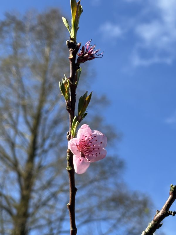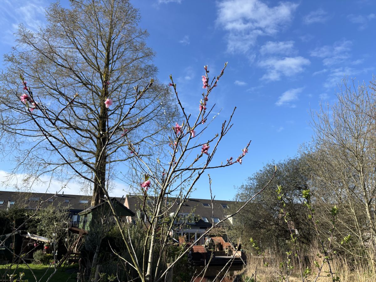 Kers Perzik klein en rond ipv plat. Ga hem dit jaar in een mega pot met een andere boom samen zetten. Dan waait hij ook niet meer om. Rozemarijn staat ook in bloei.