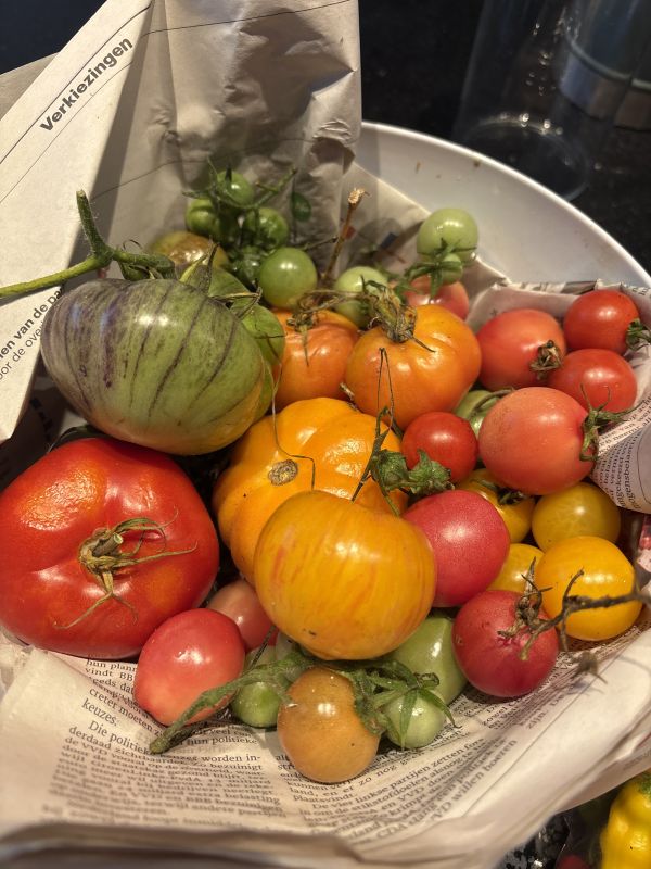 Pepers geplukt en toch nog wat tomaatjes. Plant gerooid. Links voor de tomaten de 2e bijna rijpe Malawi peppadew. Vind het een heel leuke vorm. De eerste had ik mee naar Gouda. Ik laat ze nog iets verder rijpen en dan proeven.