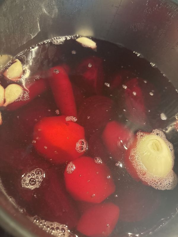 Bietensoep in wording met eigen biet knof suppengewürz met restant van gisteren. (Beef bulgogi, wel zelf gemaakt, maar niet uet)