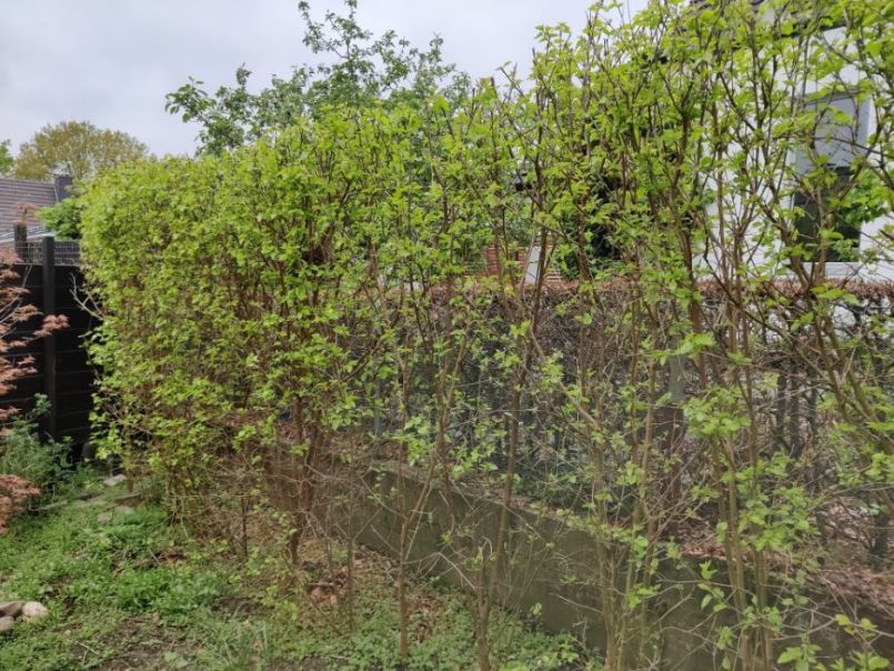 Het is allemaal morus alba. Dit is een foto van de heg na het snoeien. Ik doe dat met een elektrische heggenschaar. Niet heel zorgvuldig, vooral bovenin zie je dat hij golft. Maar hij is dus hoog, smal en zichtdicht. In de wind staat hij niet, hij staat een paar meter ten oosten van het huis. Hier zie je de breedte, ongeveer 60 cm. De beukenhaag van de buurman rechts is strakker gesnoeid, maar mij interesseert dat niet. Hij is altijd twee uur bezig en ik een kwartier.