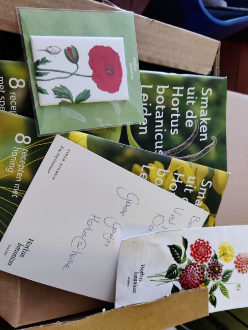 Ik kocht twee Dahliaknollen bij de Hortus Leiden, en ik kreeg een heel verrassingspakket opgestuurd. Een koelkastmagneet, twee receptenboekjes vol info, een vriendelijke kaart, en het laatste magazine van de Hortus. En de dahlia's natuurlijk, die heb ik maar even in de koelkast gelegd tot ik ze kan planten. Ik vind het heel leuk, denk dat ik ook maar vriend word van de Hortus Leiden, dus hun missie is geslaagd