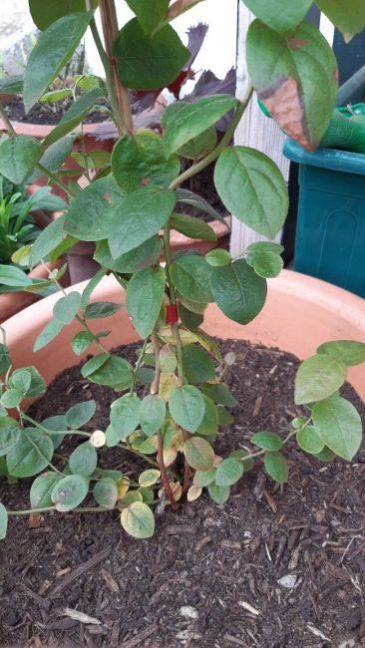 Vorige week blauwe bes geplant in pot in de turf. Nu krijgt het blad bruine vlekken en hier en daar wordt blad geel. Wat kunnen de oorzaken zijn?
