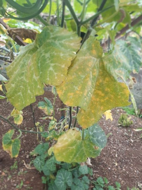 Mijn klimcourgette krijgt onder geel blad wat daarna verdort. De plant geeft veel vruchten en groeit snel. Hoe kan ik het vergelen van het blad stoppen?
