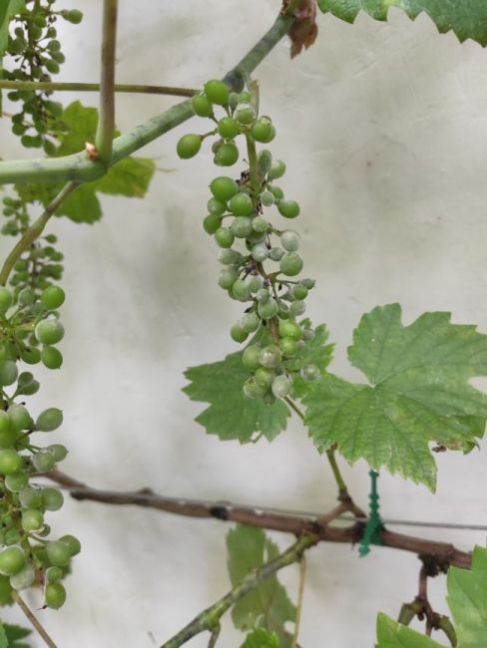 Aanvankelijk groeiden de druiven heel mooi. De laatste 3 weken beginnen er steeds meer verdroogde druiven in de trossen te komen. Veel kleinere trossen bevatten al bijna geen groene vruchten meer. Ik heb ca. 3 weken nog wat druivenvoeding van DCM en wat bentoniet van DSM gestrooid. Zou het daarvan kunnen komen of zijn er andere redenen die jullie kennen.