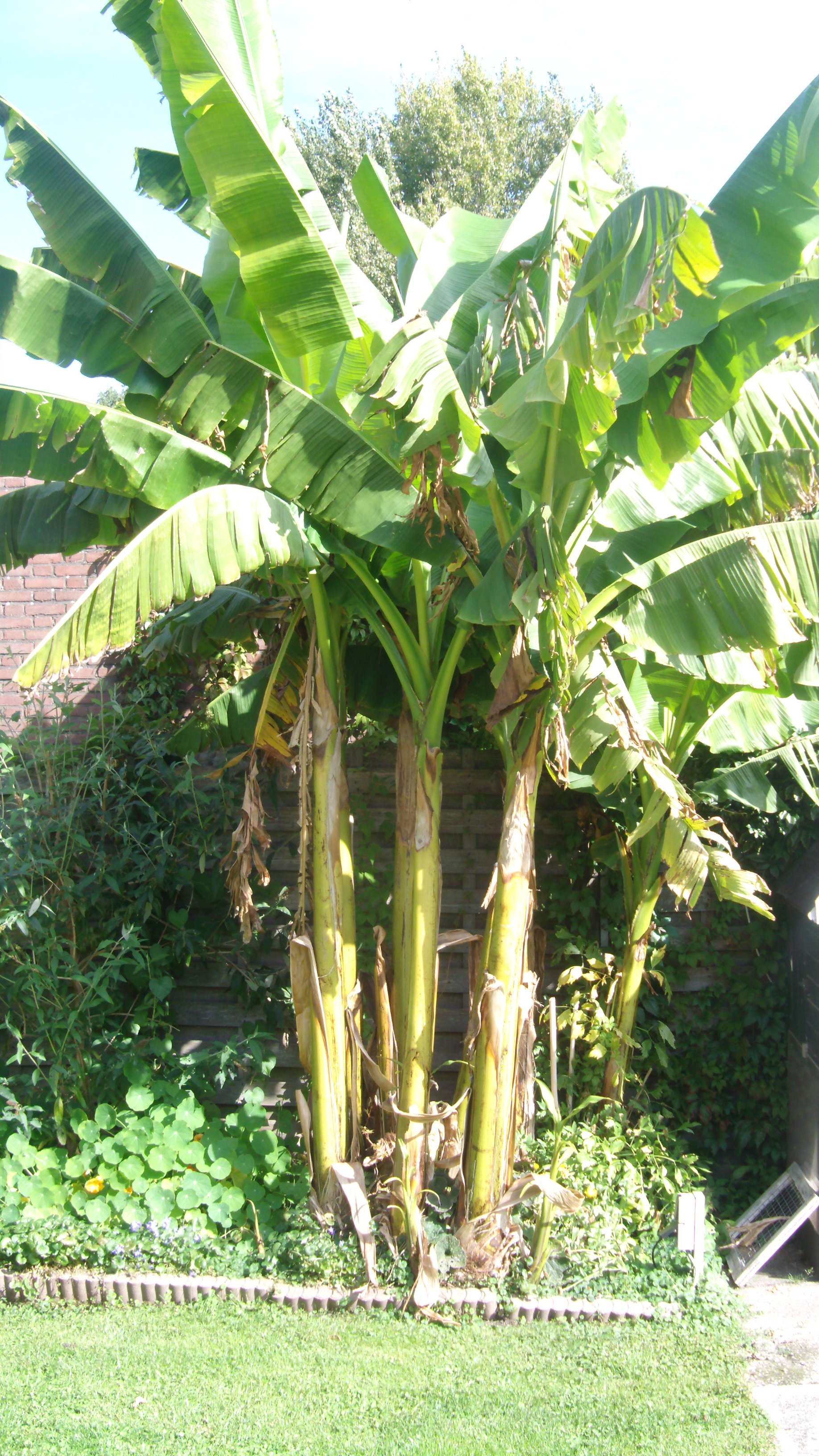 Wij hebben hier al meer dan 15 jaar een bananenplant ( Musa basjoo) in de tuin staan, nog nooit ingepakt gehad, elk voorjaar kwamen er nieuwe stekken uit de grond, alleen afgelopen winter dachten we nu is het afgelopen één berg snot lag er in de tuin, en wat schets onze verbazing meer dan 10 stekken kwamen er opnieuw uit de grond. Een stek heb ik in een pot gezet met louter alleen potgrond. Op de foto is te zien hoe hij/zij er nu biijstaat, hij/zij komt straks weer boven het PEN huisje uit.