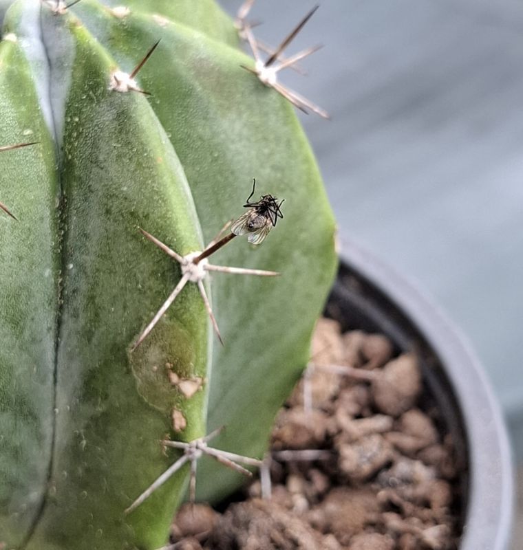 Ik spuit eenmaal per dag binnenshuis met insectenspray, als de buitendeur niet meer open hoeft. Het zijn meestal maar een paar vliegen, eventueel fruitvliegjes en varenrouwmug gaan er ook aan. Deze vlieg zocht wel een heel aparte laatste rustplaats uit. Even buiten gezet om een foto te maken, binnen op de vensterbank teveel tegenlicht. Nog dichterbij: