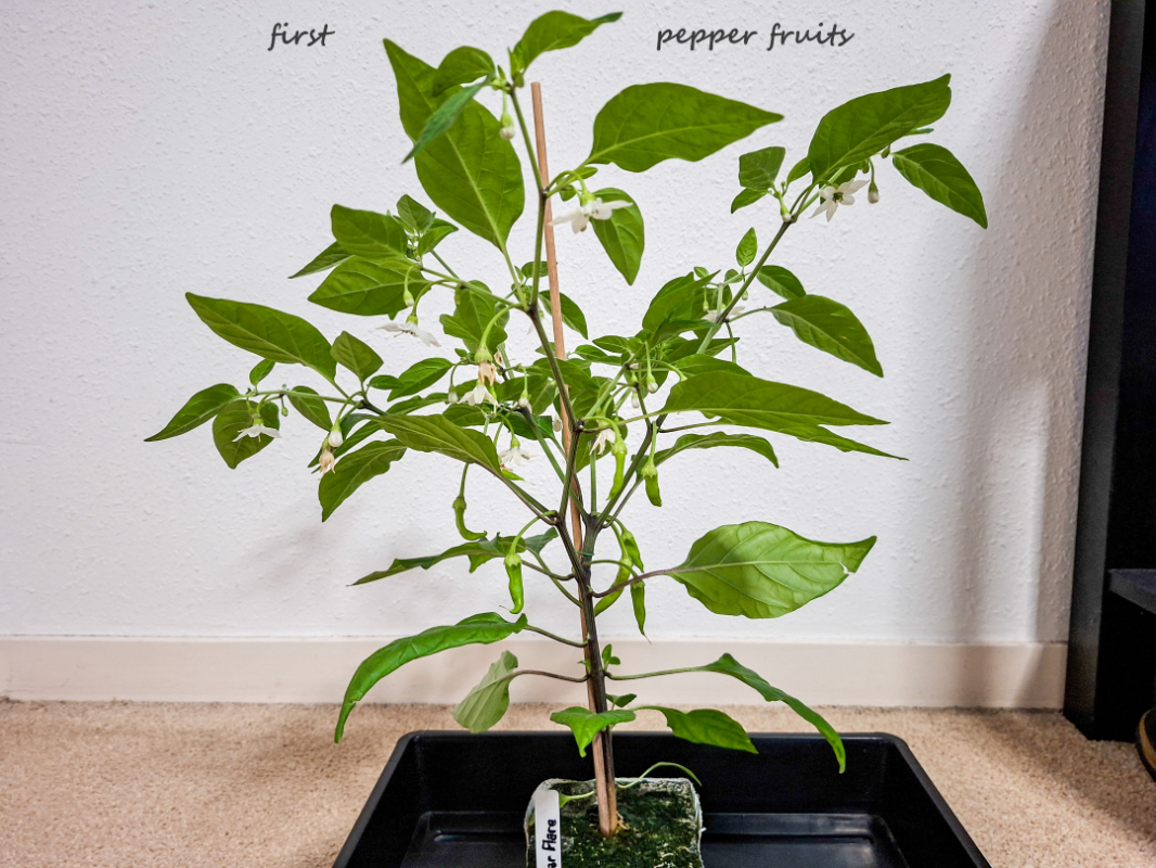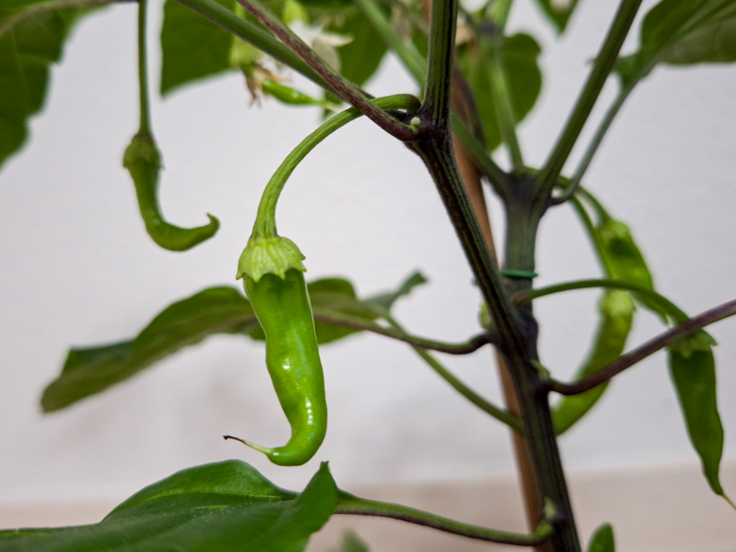 De peperplant die bij mij het verste is is de Solar Flare: deze planten worden niet hoog, ze vertakken eigenlijk direct en kunnen daardoor heel goed in een pot gekweekt worden (wordt vaak ingedeeld onder de potpepers). Solar Flare geeft een enorm hoge opbrengst van pepers die erg op Cayenne lijken. Ook de Scoville waarde is vergelijkbaar met Cayenne tot net wat lager (tussen 10.000 en 20.000). De kleur is fel oranje. Geschikt voor vele toepassingen. Ik kweek deze nu 3 jaar en vindt het een grote aanrader. Hier enkele foto's van de Solar Flare die ik zelf verder ga kweken in de kas dit jaar. Gezaaid op 10 januari. Er hangen al meer dan 10 gezette vruchtjes aan en ook nog volop bloemen en knopjes. Ik verwacht voor 1 mei de eerste rijpe te hebben want dat was vorig jaar namelijjk ook al zo. Foto's van 5 april dit jaar (dus precies een week geleden): Foto van 30 april vorig jaar: