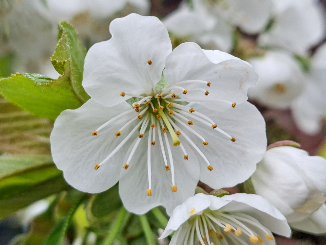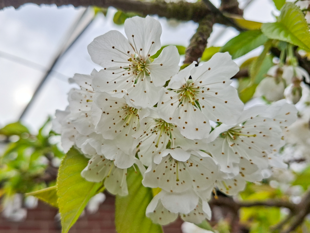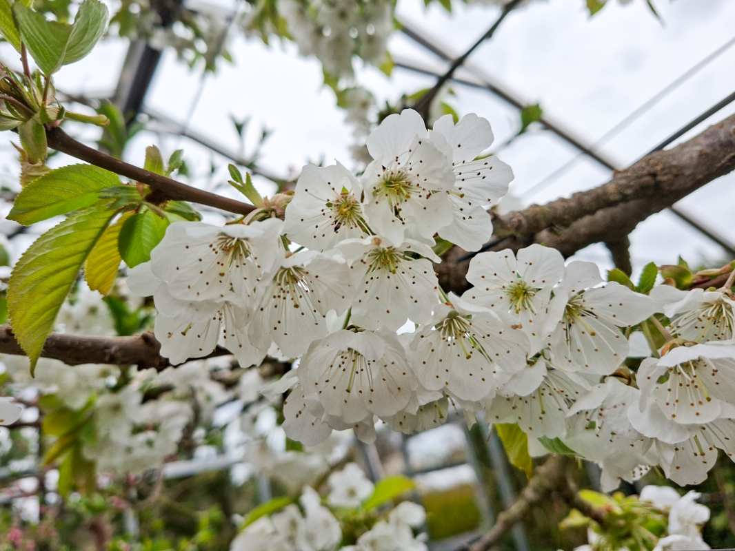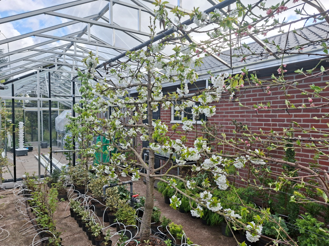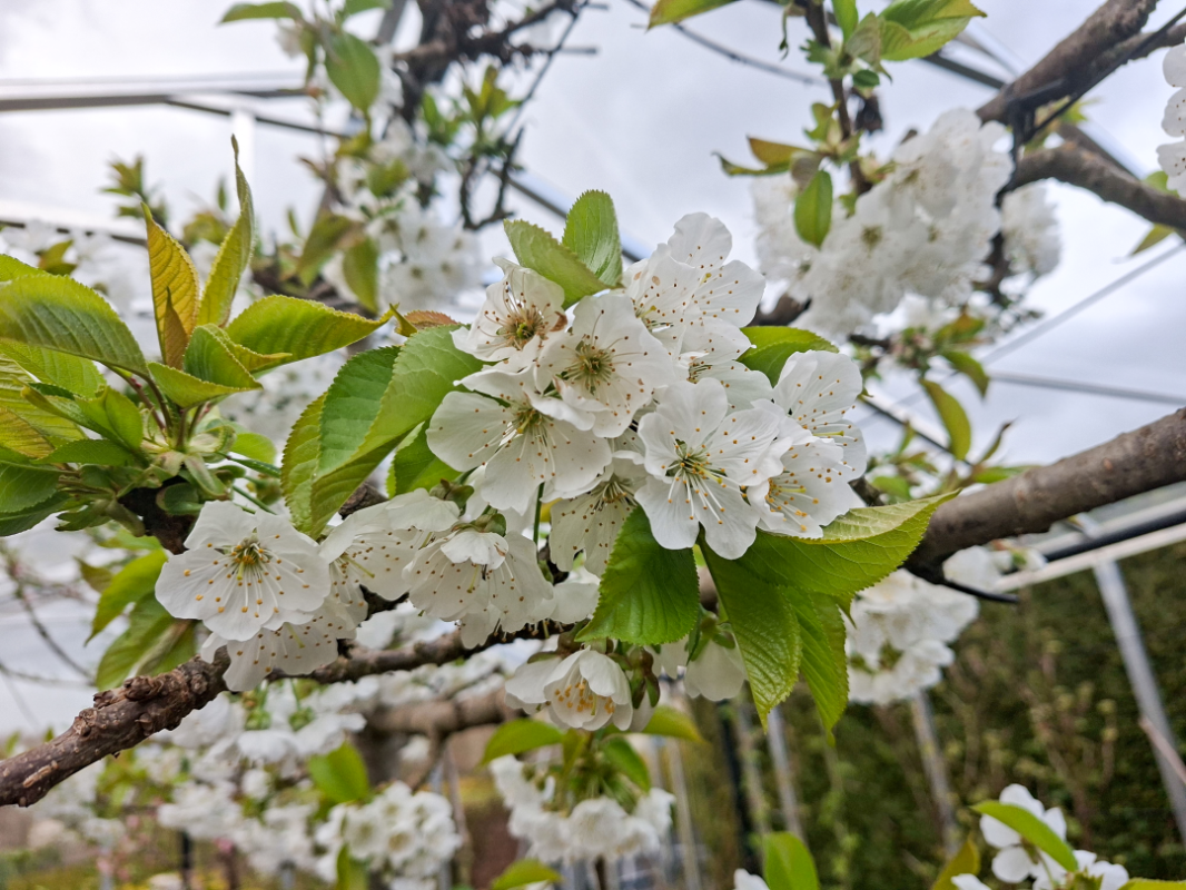 De kersenboom bij mij is al effe uitgebloeid, er hangen al diverse kleine uitgroende kersjes aan. Het ras is Lapins, ik heb hem 7 of 8 jaar geleden geplant en gesnoeid als lei-vorm. Sinds begin vorig jaar staat hij onder een overkapping van glas (samen met veel andere fruitbomen en struiken). De zijwanden en gevels heb ik dichtgemaakt met gaas. Grote voordeel hiervan is dat de kans op schimmelziekten een stuk kleiner is en dat heb ik vorig jaar al gemerkt (kers, perzik, peer). Kans op vorstschade is ook wat kleiner. Tijdens de nacht van 27 op 28 maart heeft het hier nog ruim 2 graden gevroren en vond ik het toch wel wat spannend.. Maar gelukkig geen schade aan de kersenbloesem. Door de overkapping is de oogst wat vroeger. Water geven is wel een belangrijk aandachtspunt. Hier dan met vertraging (sorry heel druk in de tuin hier nu, ik maak wel heel veel fotos maar verwerking duurt soms wat langer..) De foto's zijn van 26 en 29 maart.