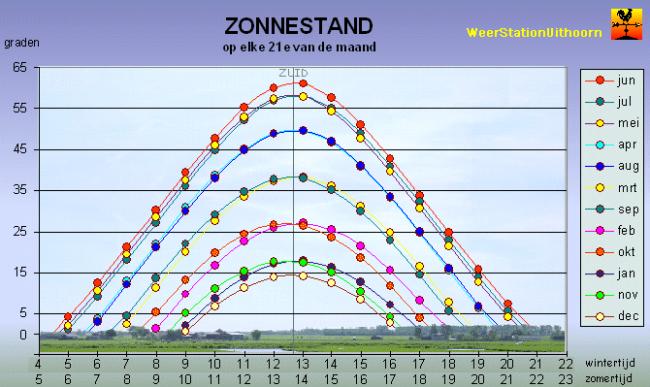 Geplaatst: 27 januari 201411 j Auteur De stand van de zon wordt bepaald door het jaargetijde en de breedtegraad waar wij leven op onze aardbol. De stand van onze aarde ten opzichte van de zon dus.Daglengte is daar een gevolg van. Een winterdag is een dag met een korte daglengte; de zomerdag een lange dag. Dat spreekt voor zich. De verschillen zijn ontzettend groot.Daarnaast maakt de stand van de zon ten opzichte van ons aardoppervlak ( op de plek waar wij leven ) ook nogal veel uit. In de winter komt het licht van een lage zon, waarvan het licht een lange weg neemt ( lange schaduwen ) en zomers andersom. Zelfs zijn daar, ook voor ons merkbare, verschillen tussen het wonen in Groningen en Midden België. Het maakt écht verschil voor de planten. Zie hier een plaatje van zonhoogtes per uur, voor de maanden van het jaar: Natuurlijk maakt ook het feit dat het in de winter doorgaans koud is, het verschil voor de planten. Het groeiseizoen is niet voor niets het seizoen dat de dagen lengen en de temperatuur stijgt.Maar het is niet alleen de koude. Het is vooral het licht, dat planten in de winter slechter groeien of in de natuur : simpel stilstaan. Dus je bent niet van de winter af, door de temperatuur simpelweg op te schroeven. "het is te koud buiten ? " " Dan zet ik alles binnen" . Dat is écht wat te simpel. Met name dáárdoor geef je de plant een groeiprikkel; je schroeft de temperatuur op, maar je biedt de plant onvoldoende licht. Je doet voor de plant alsof het mei is ( de temperatuur ), maar het licht zegt dat het januari is ! Dat groeit dan allemaal letterlijk scheef. Hetzelfde geldt in de afnemende daglengte in de nazomer en herfst. Blijf je een plant dan groeiprikkels toedienen ( veel vocht + veel mest bv ) ( en ook die combinatie met een zeer zonnige herfst ), dan gaat de plant té lang door. Te lang blijft hij groeiprikkels ontvangen, en rijpt niet goed af voor het intreden van die onherroepelijke winter + afnemende daglengte = zwakte = ziek ( of niet zó gezond" of onvoldoende winterhard. Te veel licht ( zon en warmte ) in de winter bestaat ook nog. Je kan een perzik maar beter niet de hele dag vol op zon zetten in februari en begin maart en dan ook nog eens helemaal beschut tegen de wind ofzo. De struik of boom zal heel vroege bloei vertonen en dat vriest kapot in de nacht. ( Work in progress )
