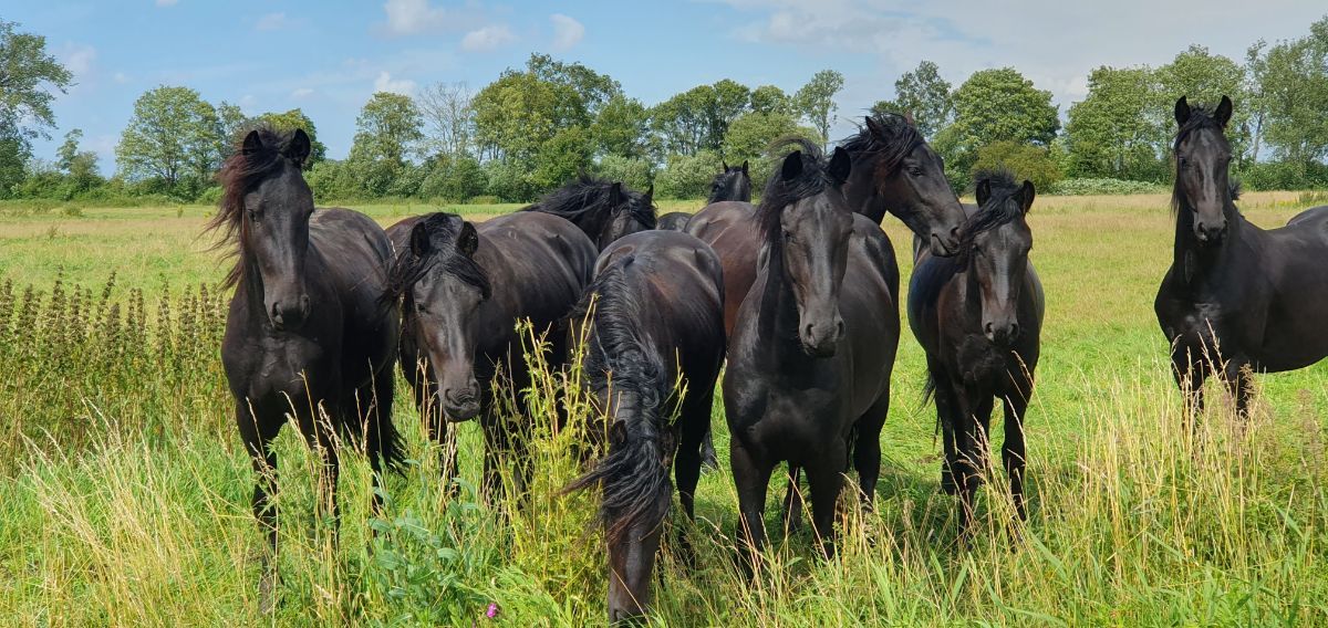 Geplaatst: 7 juli 20241 j Gisteren, ter voorbereiding op een voor Zowie angstige avond/nacht vanwege voetballawaai (vuurwerk en harde toeters), een langere wandeling gemaakt (langs de Weg naar het Klooster-pad). Daar staan dus elk jaar kuddes met Friese hengsten in de weides daar. Prachtige jonge dieren. Nu waren ze eerst erg geinteresseerd in de nieuw geplaatste kudde aan de overkant.... totdat... ik met Zowie langsliep... Toen waren alle ogen op haar gericht. Het is echt net of ze zich van alles afvragen... Wat is dát??? Is dat een mini paardje??? Kijk naar die hoofden. En ze kijken echt niet naar mij maar naar haar: Zowie, die net niet wegwaait. (En die wegens het trauma pas om 5 uur vanmorgen uit haar schuilplaats durfde te komen... het leek hier wel Oud en Nieuw, arm ding. Dus woensdag slapen we op het complex... stel je voor dat Engeland verliest... ) Ze is nu trouwens weer ok, alleen het onweer was wel weer een trigger.