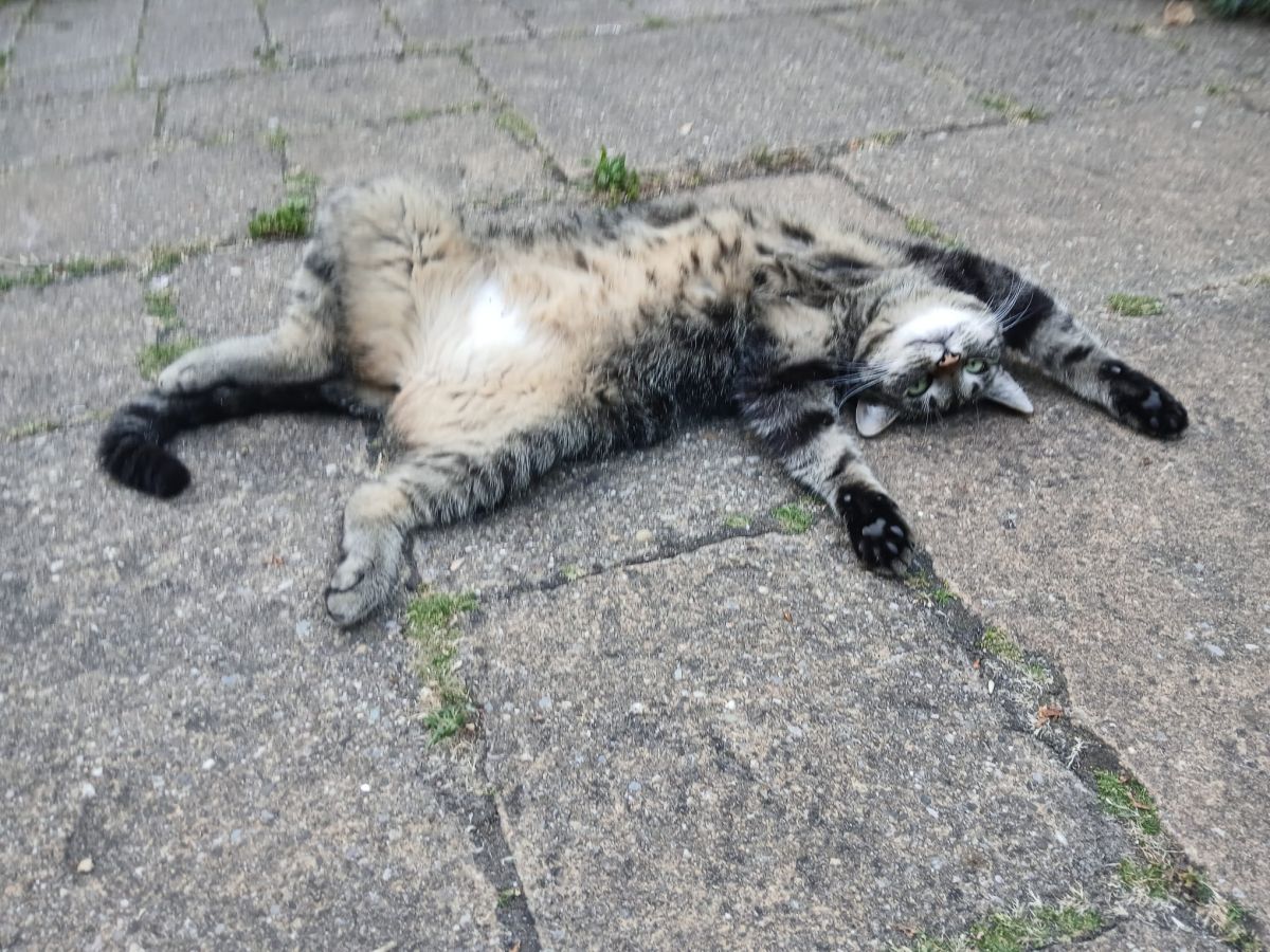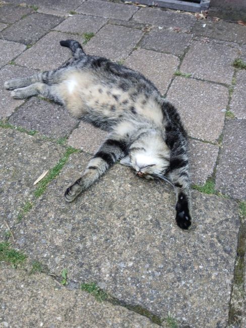 Geplaatst: 30 juni 202530 Jun Game over.Gisteren had ze nog de puf om een woelmuis om te leggen. Ik zie dat ik een klein jaar geleden een soortgelijke foto heb gepost. Ook zo warm destijds. Ik vind het altijd sneu die hitte.