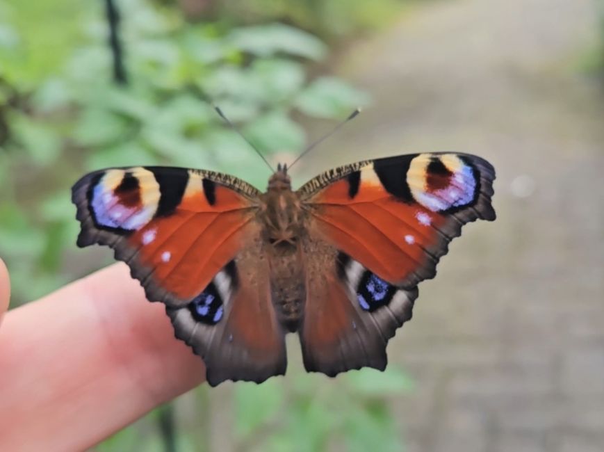 Geplaatst: 3 juli 20241 j 7 stuks Dagpauwogen zijn gisteren uitgekomen, na ontkrullen van de vleugels, heb ik ze voorzichtig op de vinger laten lopen, en de vleugels vol laten pompen in het zonnetje. Zodra ze stoppen met rillen, sluiten ze de aders in de vleugels, scheiden ze de overtollige vloeistof uit- en vliegen ze weg. Heb een paar vlinders gelijk op de Buddleja zien landen, dat komt wel goed. Ze zaten als rupsen op een brandnetelbosje wat nu al een weekje niet meer is. Om die reden (voorspelbaar maaigedrag) de rupsen naar andere netels verplaatst, en daarnaast 15 stuks thuis laten verpoppen. Na verpoppen, zijn ze voorzichtig in een poppenkast (kartonnen doosje) gehangen en goed in de gaten gehouden. Op 1 helaas vervormde vlinder na, verder gezonde Dagpauwogen los kunnen laten, met een klein beetje extra bescherming tegen vogels, vocht en warmte. Ware kunstwerkjes. Hierbij eentje net een moment voor het uitvliegen.