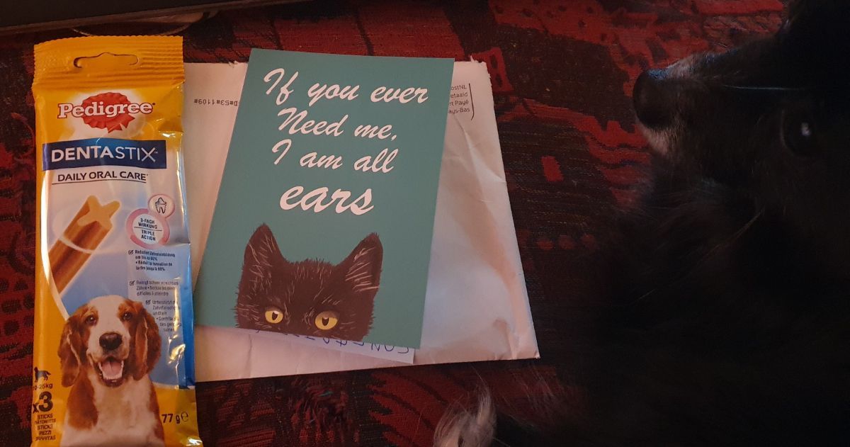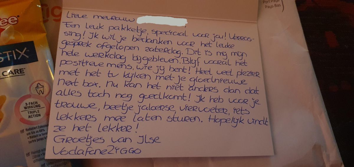 Geplaatst: 18 februari 20251 j Joepie, de TV doet het weer. Maar dat is niet de jubel. Uhum... de AB van de Ziggo Nextbox was er vandoor gegaan. Na echt heel goed zoeken in mijn huis bleek deze echt niet te vinden. Dus geprobeerd een nieuw exemplaar te koppelen (samen met vriendin die helpdeskt bij de Ziggo). Alleen dat wilde dus niet omdat de oude nog werkte, batterijen zaten er nog in. En bleef de softwareupdate dus hangen bij een overbodig stuk text waarin Ziggo aanbevelingen wil geven en ik NEE moet zeggen... maar moet ik met pijltjestoetsen van mijn... afstandsbediening!!! doorscrollen. Tja... die doet het dus niet... en dus zat de box vast. Kon nix meer. Dus toch de Ziggo maar gebeld zaterdag. Aardige dame aan de lijn die veel moeite deed en mijn relaas ook wel vermakelijk vond. Ondertussen was mijn Zowie wat jaloers omdat ik het gezellig met iemand anders had. Aardige dame regelde dat er zsm een nieuwe box zou komen en we namen afscheid. Krijg ik vandaag een Ziggo enveloppe door de bus... Ojee... voelt alsof er een AB in zit... Maar ik zou toch een nieuwe box krijgen... Ojee als het nou maar niet nog langer duurt.... Enveloppe open: En zie daar..... zoooo leuk !!! Iets lekkers voor Zowie, ja dat is haar daar aan de rechterkant, zeer geinteresseerd, en een kaartje! Wat zou daar nou instaan? Nou ja... het is van de Ziggodame!!! 🤩 Wat een ontzettend lieve actie. Dit is me nou nog nooit gebeurd. Dus een jubel voor Ilse. 🎉 ps. Het duurt nu vast niet lang voordat de oude AB weer opduikt, zoals dat altijd gaat.